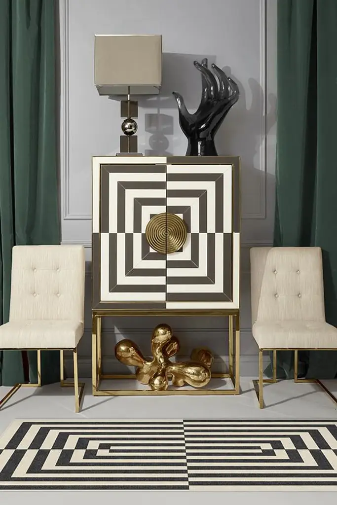 Graphic go-anywhere funster. This charcoal and off-white geometric rug mesmerizes with its dynamic, op art-inspired pattern. Water-resistant, stain-resistant, and machine-washable.