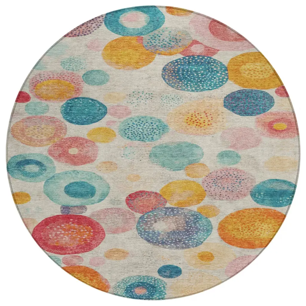 'Op Art' Flower Field is a rectangular wool rug.Optical Art, Op Art for short, is a form of geometric abstract art. The concept of exploring and executing optical perceptions in a woven rug was first trialled a decade ago by Zollanvari and further developed since… using devices such as recurring simple forms and rhythmic patterns, vibrating colour-combinations, moiré patterns and multiple perspectives. This design of concentric colourful circles in varying sizes in multiple formations is exceptionally artful.
