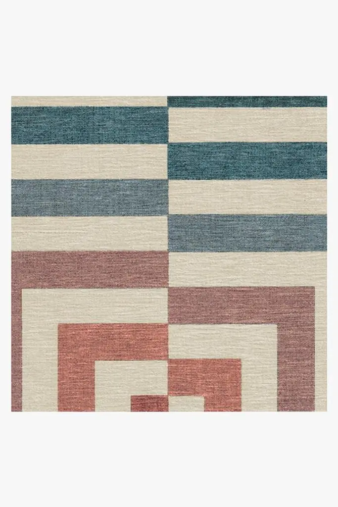 A stunning piece that commands attention. This graphic rug features a mid-century modern-inspired linear pattern in eye-catching shades of teal, mauve, coral, and terracotta. Water-resistant, stain-resistant, and machine-washable.