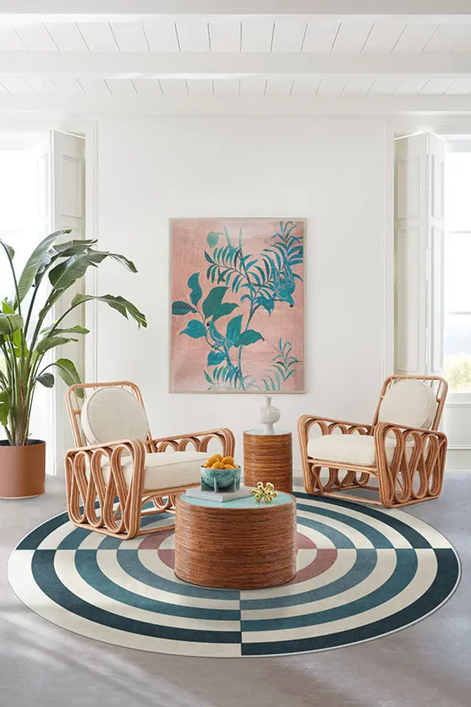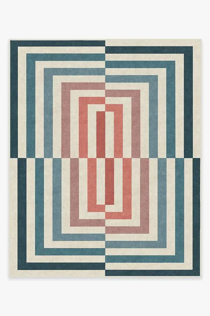 A stunning piece that commands attention. This graphic rug features a mid-century modern-inspired linear pattern in eye-catching shades of teal, mauve, coral, and terracotta. Water-resistant, stain-resistant, and machine-washable.
