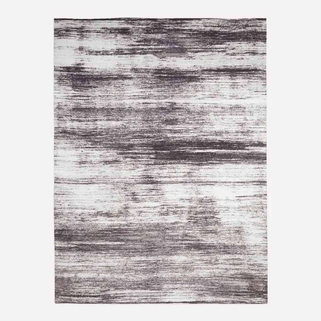 Blurred colors and stripes create a dynamic feel. Handcrafted from durable, shed-resistant nylon. The perfect option for high-traffic areas.