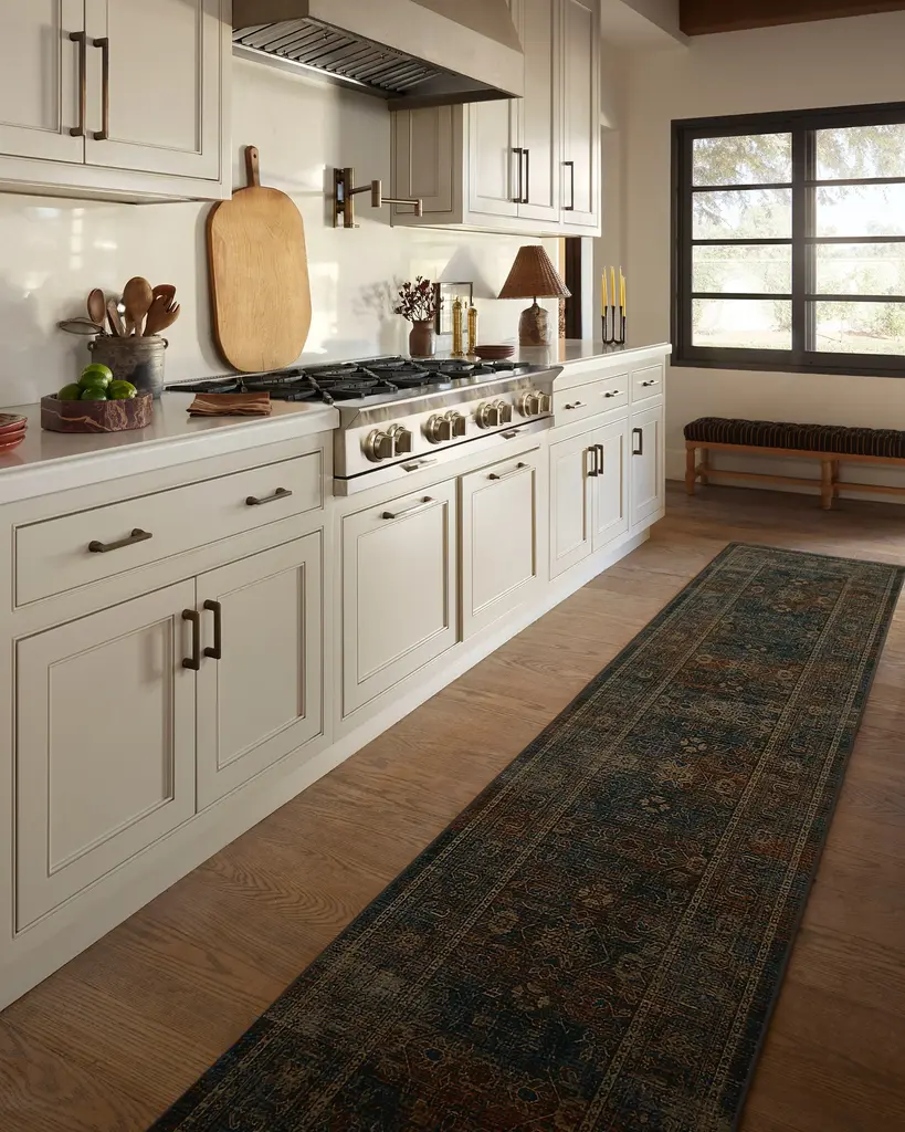 Simple to style. Easy to enjoy. Inspired by vintage rugs, our Ophelia Navy & Redwood Rug is a fresh take on antique style with a rich color palette and detailed depth.. Featuring a smooth blend of midnight blue and navy background colors, occasionally you'll discover delicate pops of light blues and warm beige. Large drops of terracotta add a finishing touch to this lovely, bordered design. Water-resistant, stain-resistant, and machine-washable. Rug colors may vary slightly according to your device and the lighting in your space.