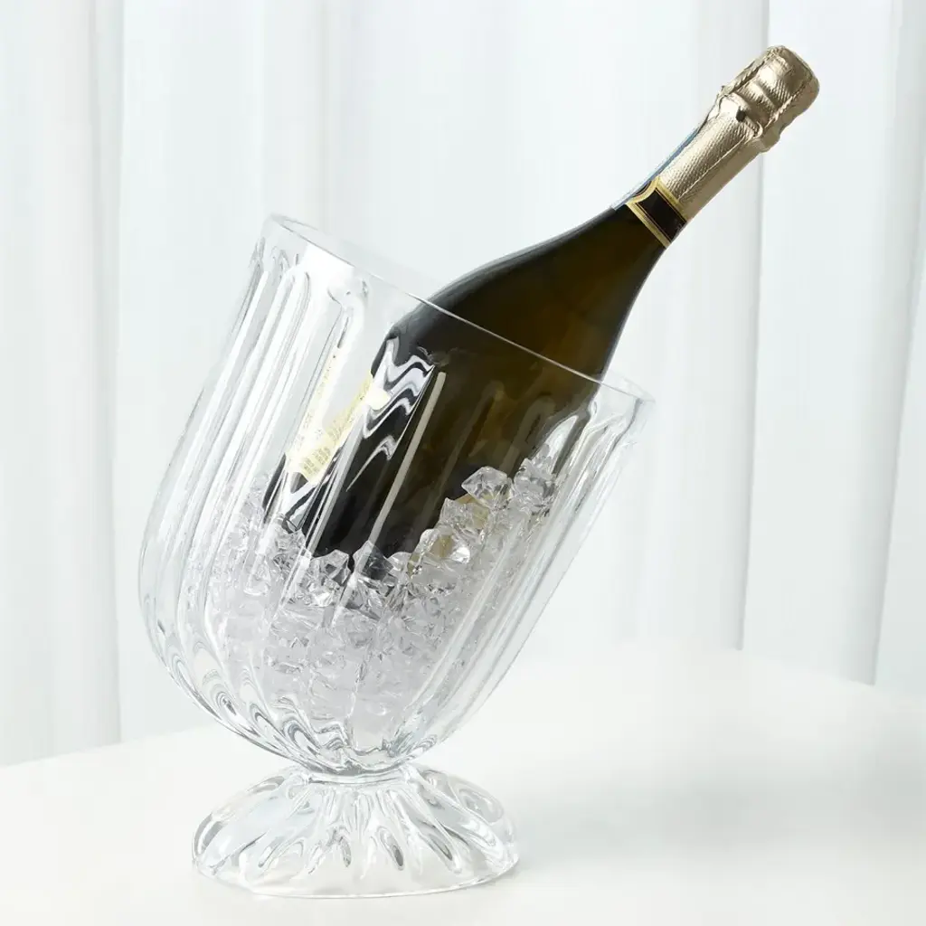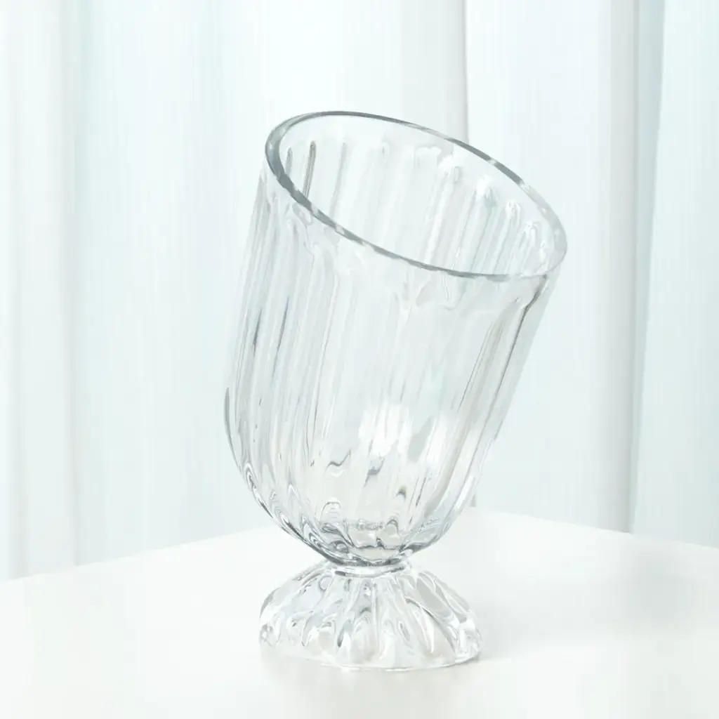 Your eyes do not deceive you! The unique tilt on the Optic Slanted wine chiller makes this piece perfect for entertaining with panache. Only slightly slanted, the chiller, made of Portuguese ribbed glass, sits perfectly on its attached base. From a fashion forward perspective, Global Views offers accessories, furniture, statement lighting, and an assortment of rugs and mirrors to add beauty and joy to your home.