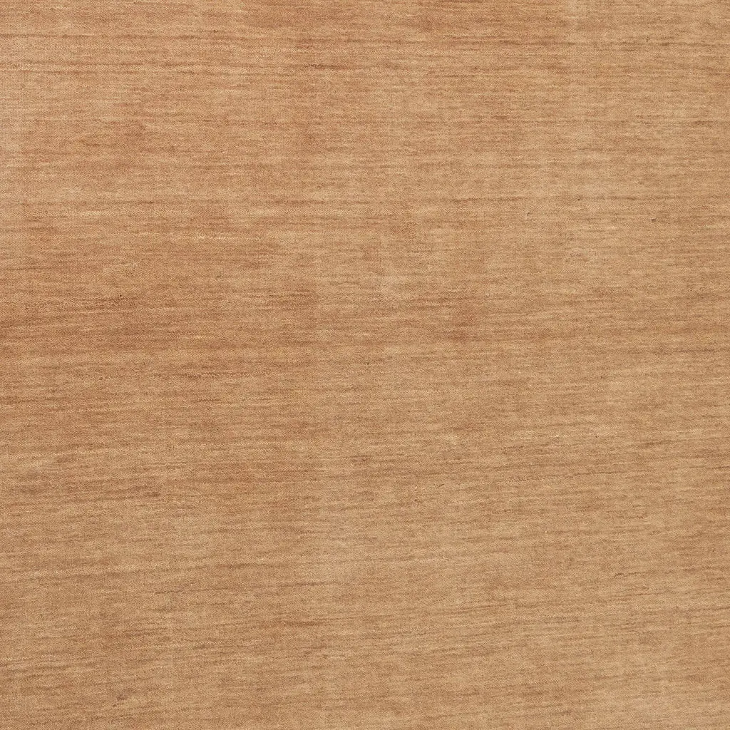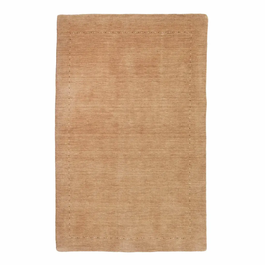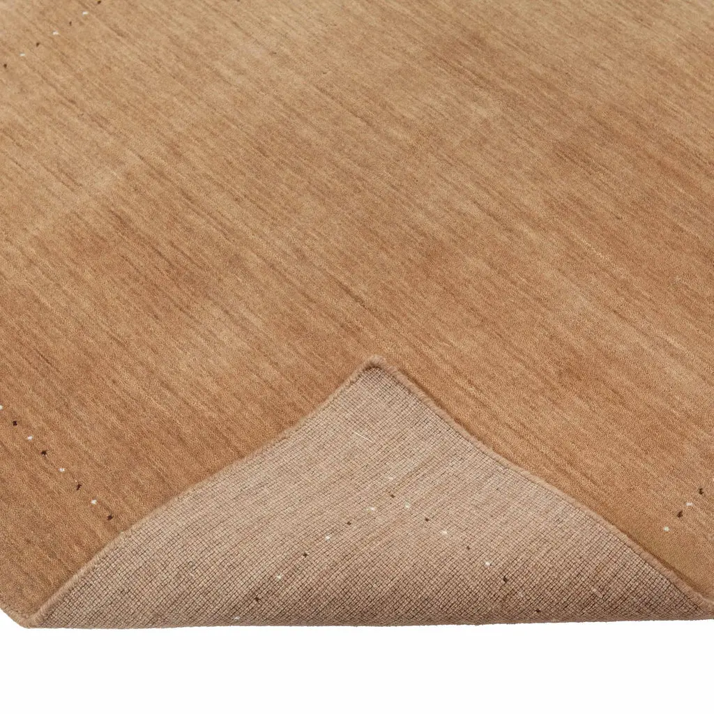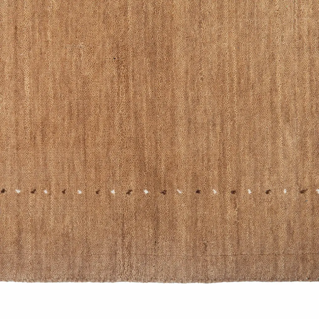The Orange Solid Indo Gabbeh rug measures 4'2" x 5'10" and originates from India. Hand-knotted with high-quality wool, this rug features a simple, neutral design with a light tan color and darker border. The stitched detail adds a touch of elegance, making it a beautiful and timeless addition to any home.