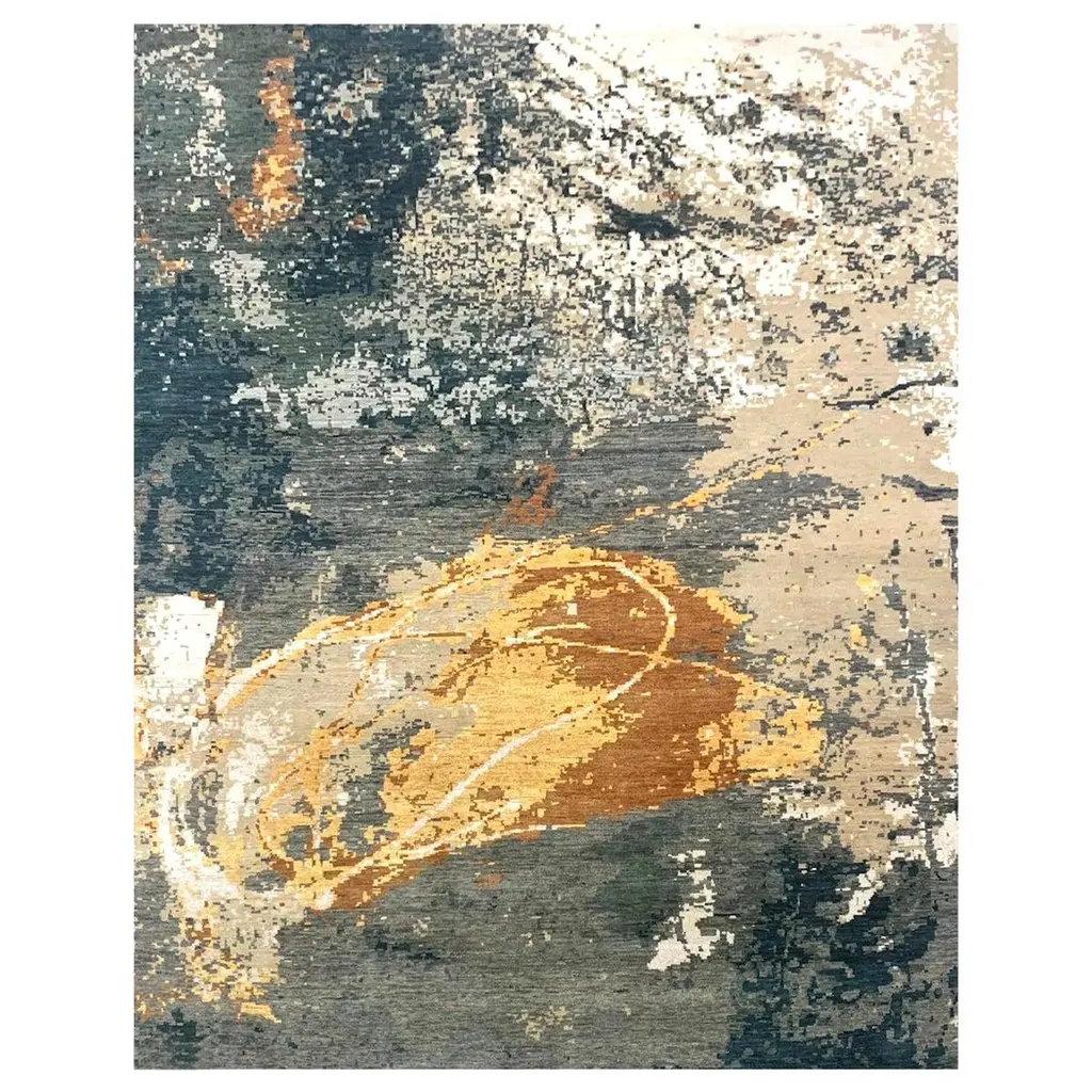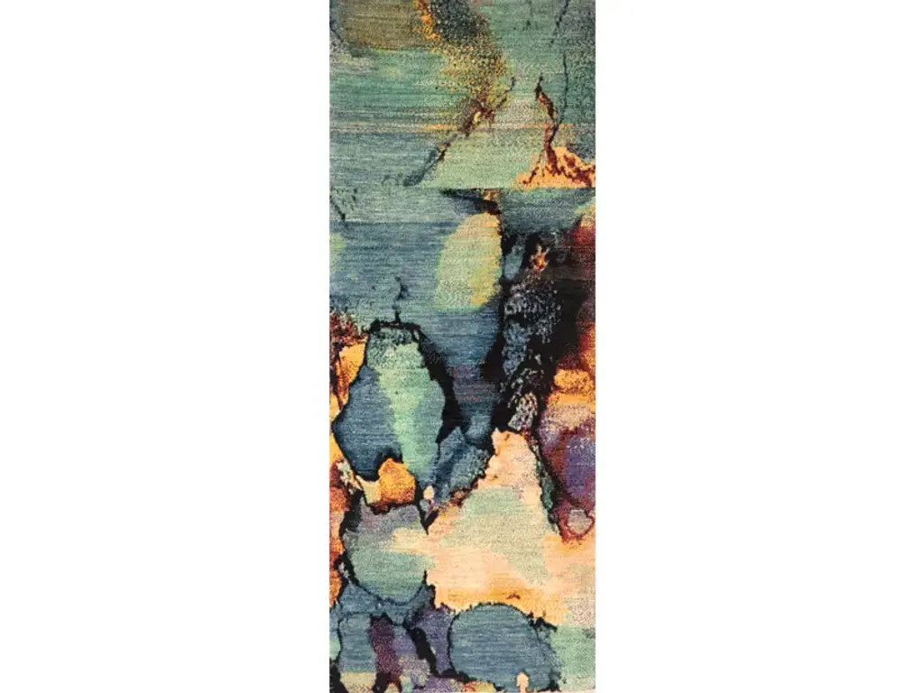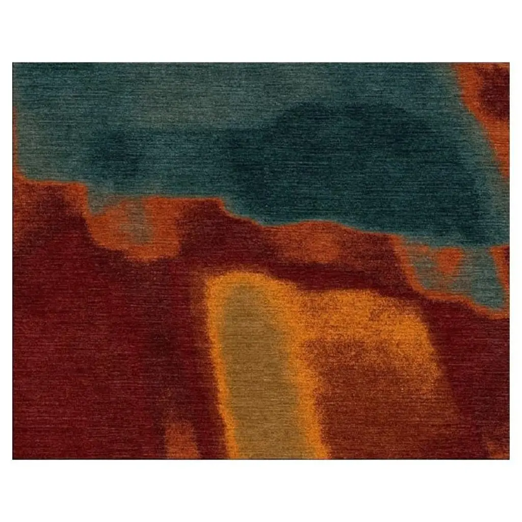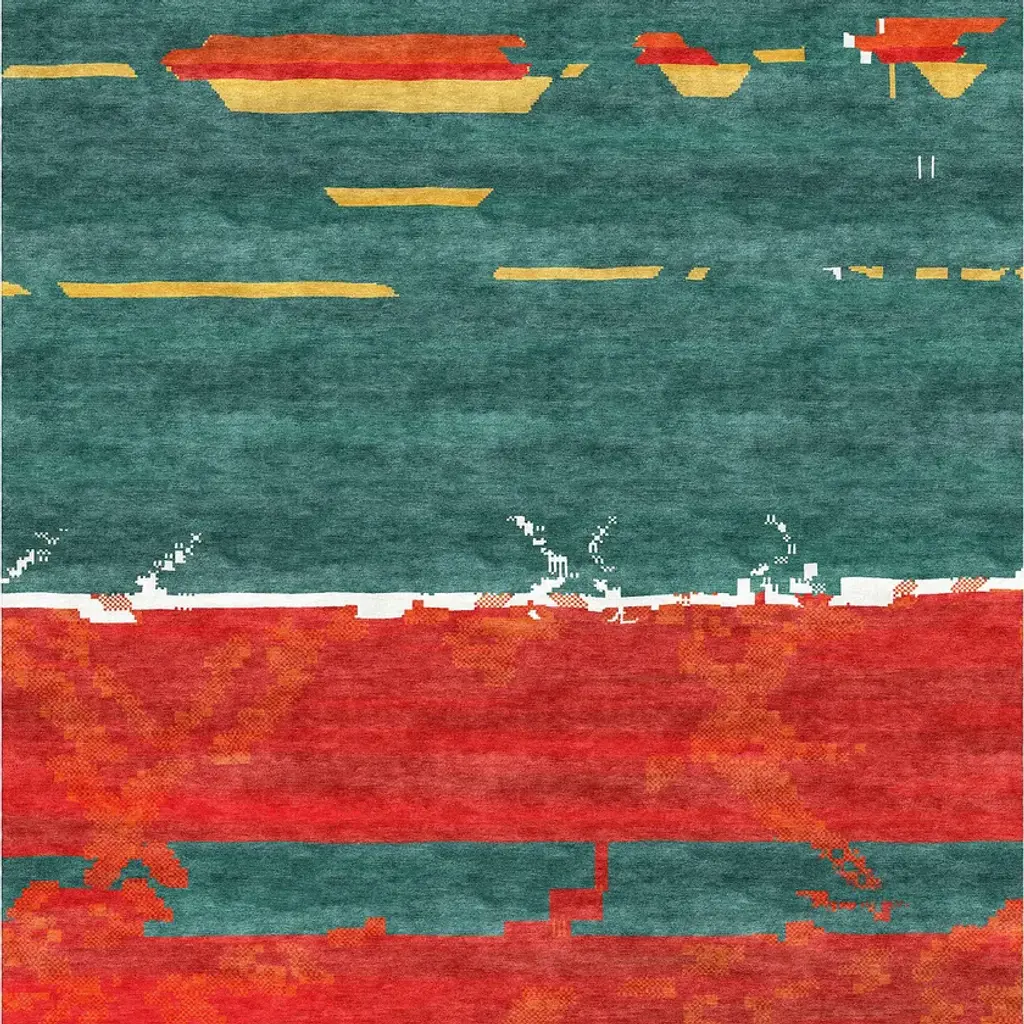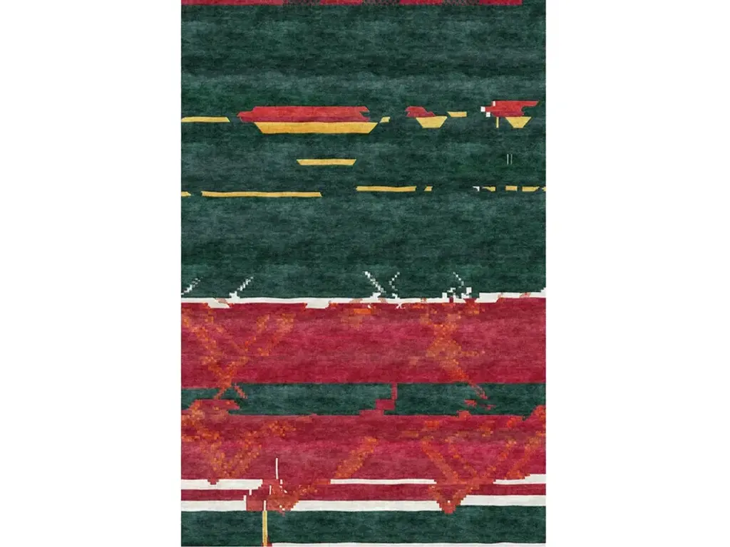 Orchard 1 is a rectangular wool rug.Zollanvari Fine Gabbehs.The stylised trees of the orchard line up horizontally at the foot of this Gabbeh and are planted in the richest of soils, beyond is the meadow dotted with floral bushes and exotic birds. This is paradīsus, as rendered into Latin from the Avestan word pairidaēza-, albeit the contemporary Glitch version.The inspiration for this latest collection is an ingenious fusion of traditional Gabbeh iconography and Glitch art – a visual style characterised by using digital or analogue errors for aesthetic purposes, whether that be intentional (that is, “faking glitch” and obtaining a similar aesthetic through design) or by accident (a true manifestation inside of the system without human intervention). The term “glitch” itself originates with engineers and astronauts to explain faults within the technology they were working with. But the visual aesthetic can be traced much further back, to the beginning of the 20th century through distorted forms in cubist paintings, abstract short films and pixel-like rug designs akin to 8-bit video game landscapes. In fact, many antique rugs feature abstract, distorted patterns that seem to predict the glitch movement of later centuries. This new collection, including its marketing and sales, will set off a new Gabbeh revolution. The designs are available in custom and bespoke sizes and colours.