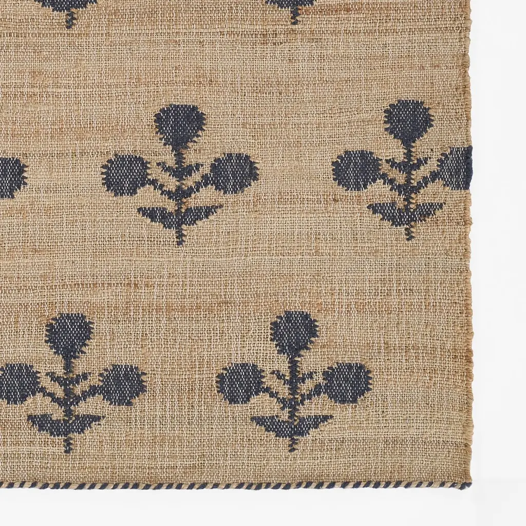 Flowers reminiscent of those found in classic Indian block prints bloom against this rug's neutral ground. Handwoven of soft, durable wool and jute, the rug is a welcome addition to just about any space. A rug pad is recommended to help prevent slipping and extend the life of the rug.