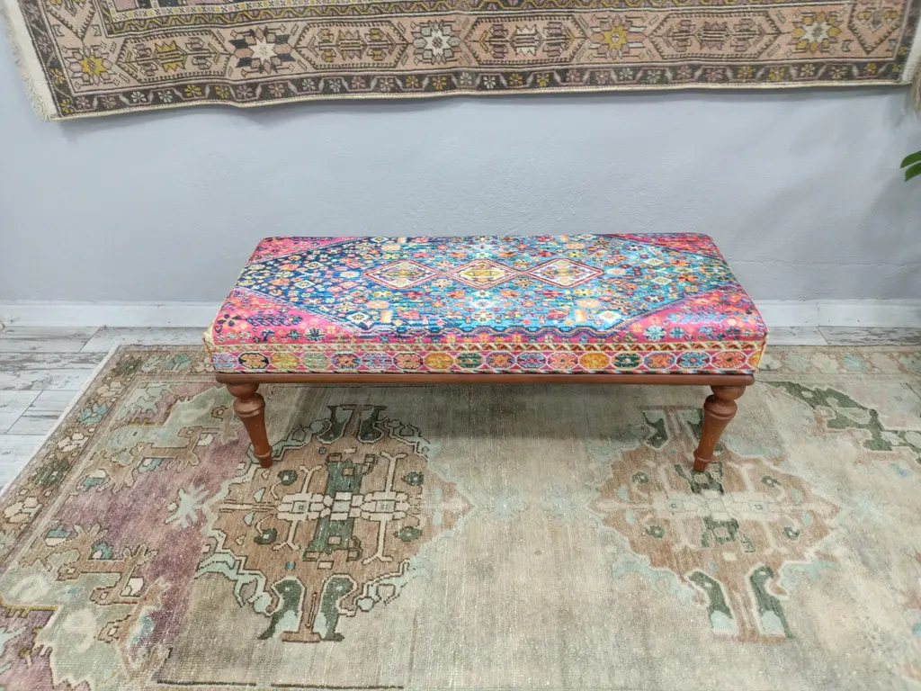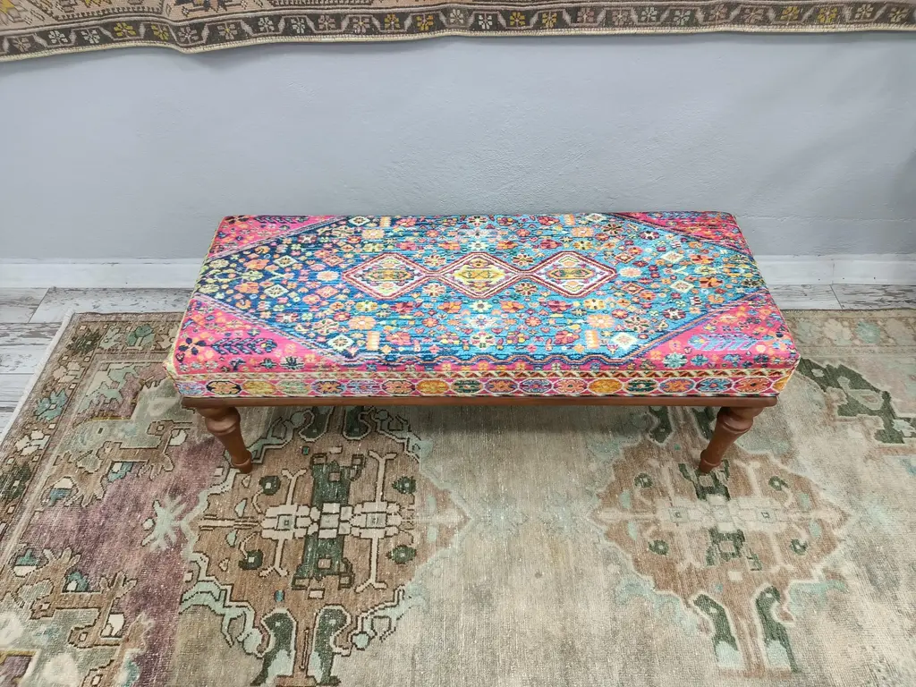Oriental Rug Print Fabric Upholstered Entryway Bench