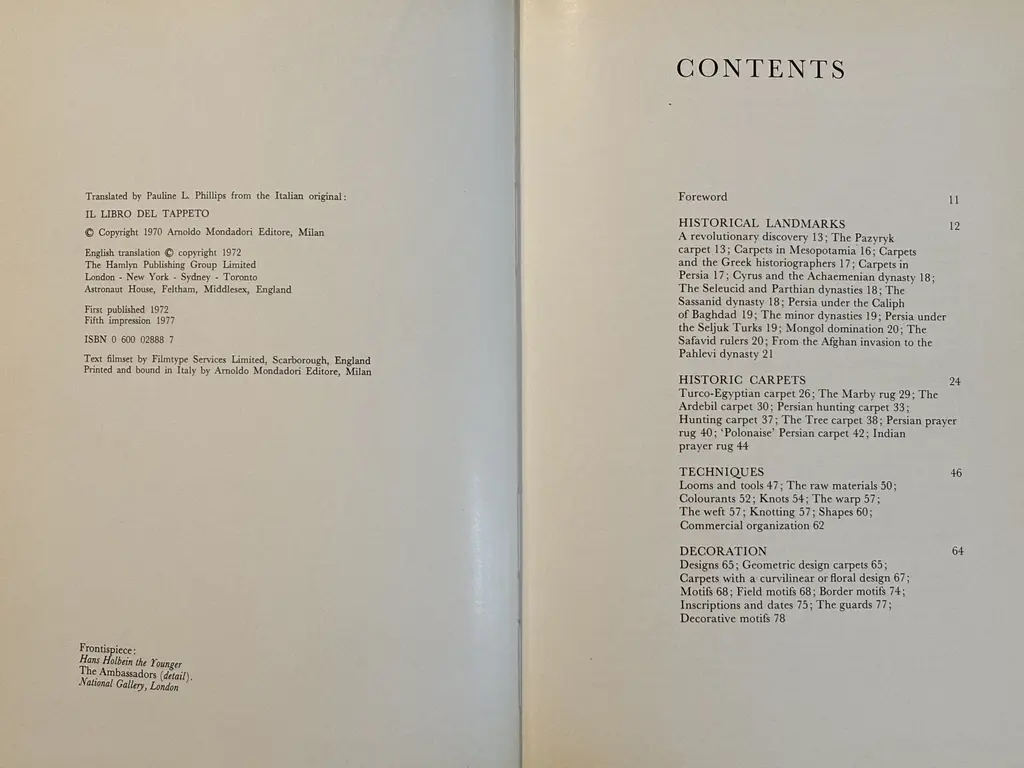Oriental Rugs and Carpets by Fabio Formenton. Hardcover book with dustjacket, published in 1977 by Hamlyn Publishing Group. Printed and bound in Italy. Illustrated, 250 pages.