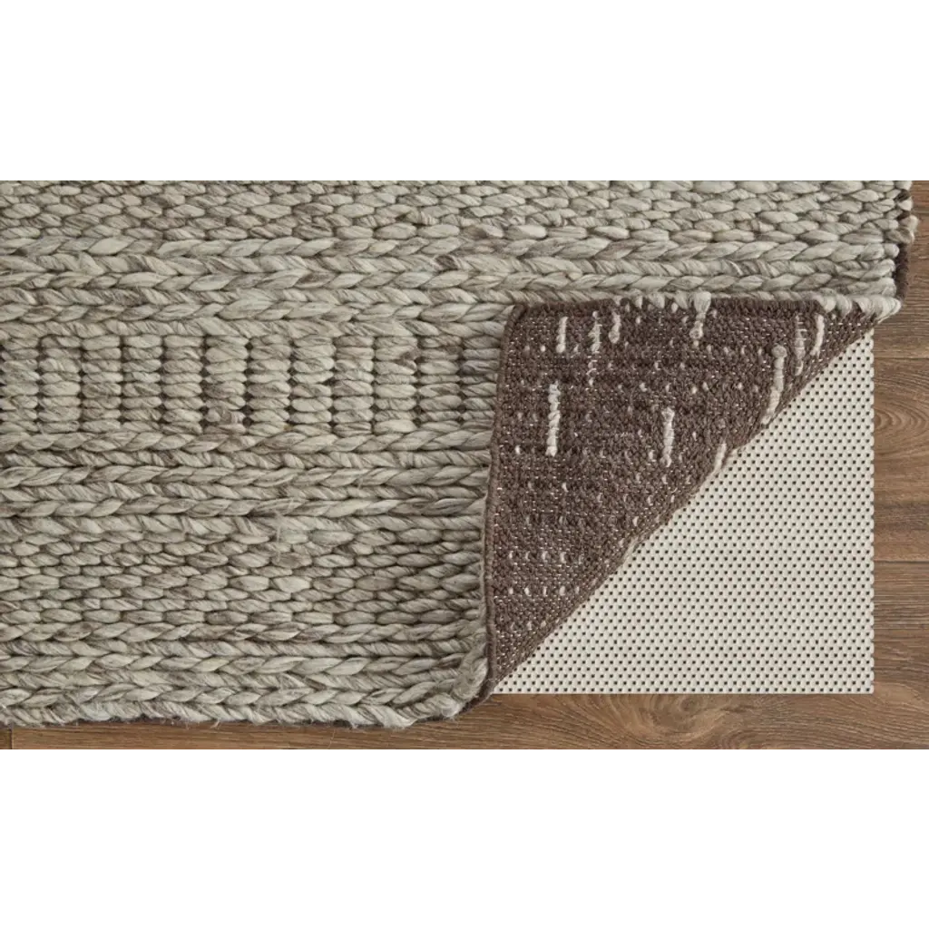 This wool rug is reliably stain resistant, so it's sure to hold up to dinner guests and messy little eaters around your kitchen table. It's handmade in India from 100% wool with a moderate, 0.39'' pile height that provides some padding while holding up to foot traffic. This area rug has a striped pattern of different hand-hooked and looped textures, in a neutral, textured oatmeal color that's sure to fit right in with your farmhouse decor. Just keep in mind: We recommend putting a rug pad underneath to keep it secure.