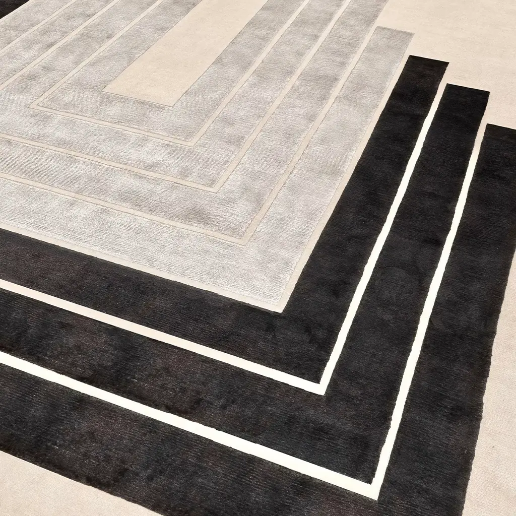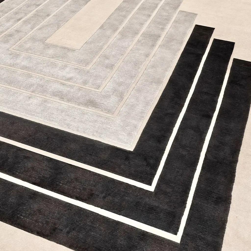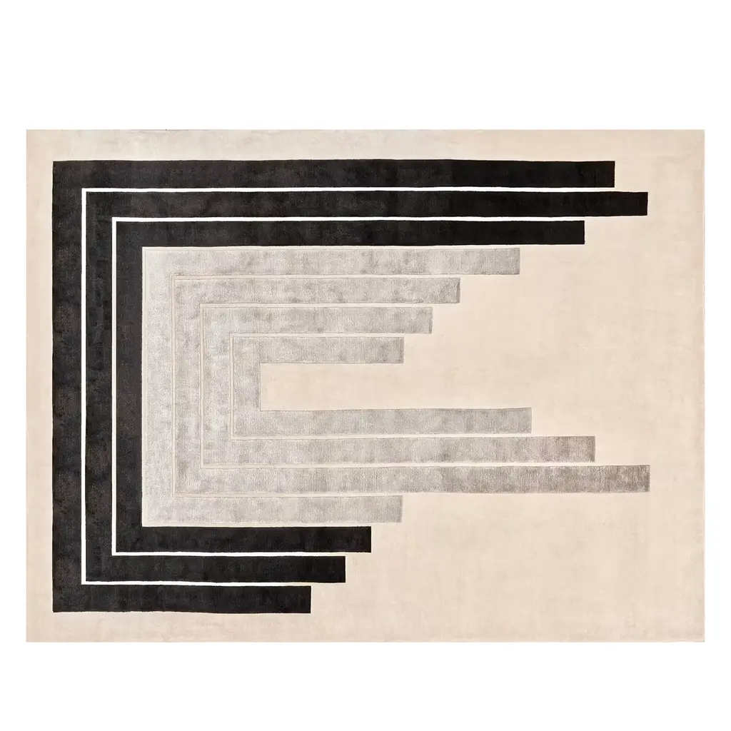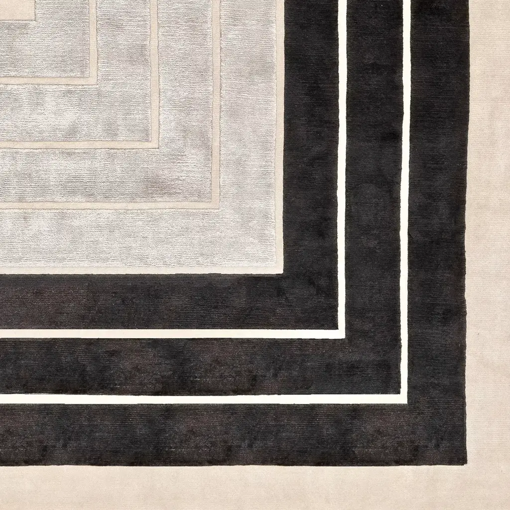 This elegant rug is an exquisite piece of floor decor hand-knotted in Nepal by master craftsmen blending an equal percentage of shimmering silk and soft Himalayan wool. Onto the beige base (H .05cm) is set a captivating design (H .07cm) of concentric frames in black and gray that stop abruptly at different heights inducing the gaze to complete their silhouette. This 152,000 piece can be customized and requested in a stain-resistant variant, please ask the Concierge for options and pricing.