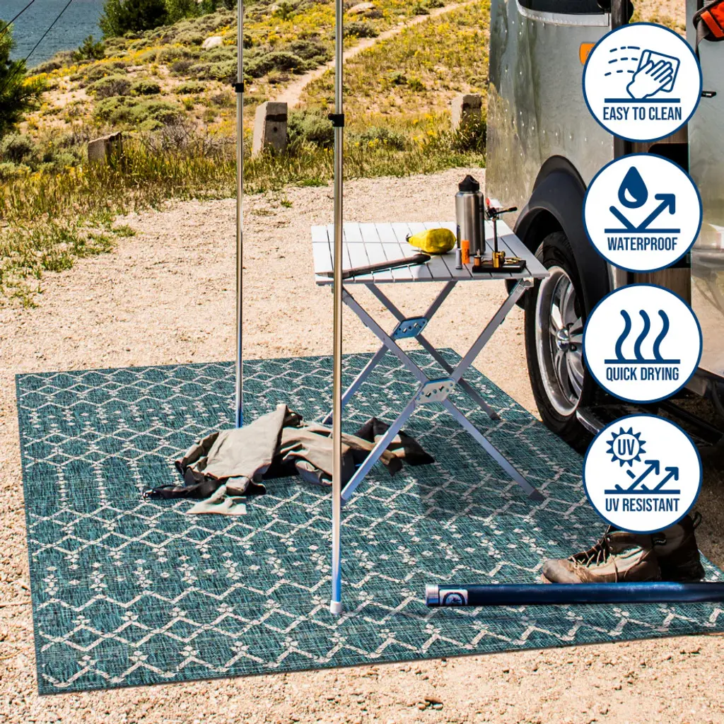 With its geometric design inspired by Moroccan tribal patterns, our Boho-chic rug adds eclectic style to an outdoor porch or patio. Varied tones of deep blues and teal mingled with a light gray pattern give this rug a hand-woven, vintage vibe. The flatweave design is great for high-traffic spaces indoors too.Features:• Flat-weave construction of 100% polypropylene• Light gray and deep teal blue with a handwoven mingled texture• Water resistance with 0.19" pile• 100% Polypropylene• No backing, use of rug pad is recommended (sold separately)• Power Loomed in Turkey• Actual Dimension: 5 ft. 3 in. x 7 ft. 7 in.• Color: Teal/Gray• Thickness measures: 0.19 in.• Available in multiple sizes and/or colorsRug Care:• Durable and easy-care - just sweep or hose down with mild soap and water• Packing and shipping may cause temporary creases in rugs, which will flatten out after a week on the floor; to expedite the process, try back-rolling your rug before laying it down, and then allow ample time for the remaining creases to relax• Please Note: Due to differences in monitors, some rug colors may vary slightly. Lengths and widths may vary from the published dimensions. Patterns may vary slightly according to shape and size selected.About us:Style your floors with JONATHAN Y. By combining fine craftsmanship and design, this New York creative studio is bringing fashion to your floors. The collection mixes sustainable organic materials, vibrant colors and trend worthy styles to create JONATHAN Y''s distinctive catalog of rugs.
