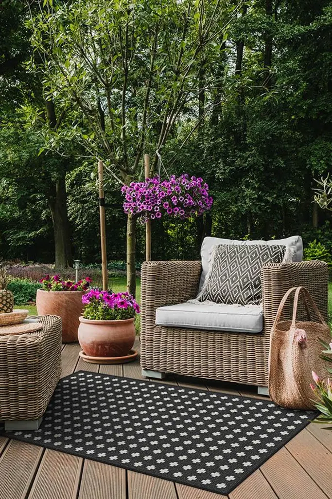 A timeless style. Our Adde Black Rug features an all-over print of off-white crosses on a black background, this modern outdoor rug will add a chic accent to your patio or deck. The extra-durable, machine-washable material is perfect for both outdoor and indoor use, especially high-traffic areas and those exposed to the elements.