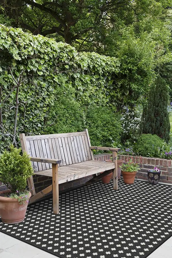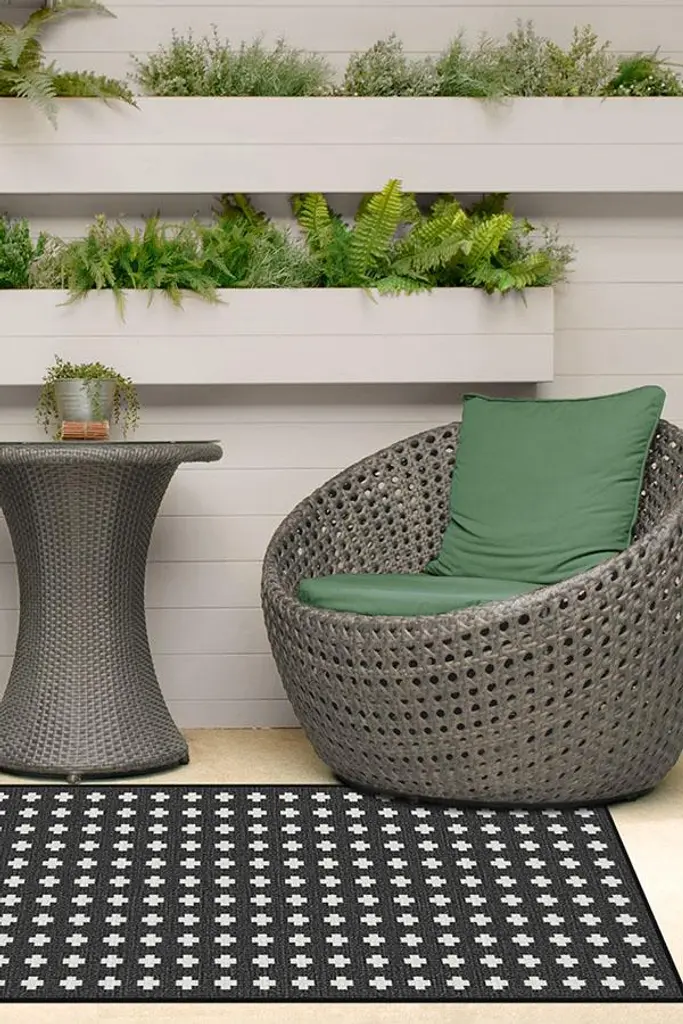 A timeless style. Our Adde Black Rug features an all-over print of off-white crosses on a black background, this modern outdoor rug will add a chic accent to your patio or deck. The extra-durable, machine-washable material is perfect for both outdoor and indoor use, especially high-traffic areas and those exposed to the elements.