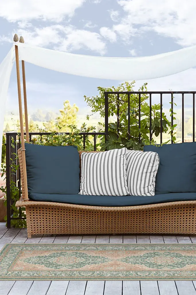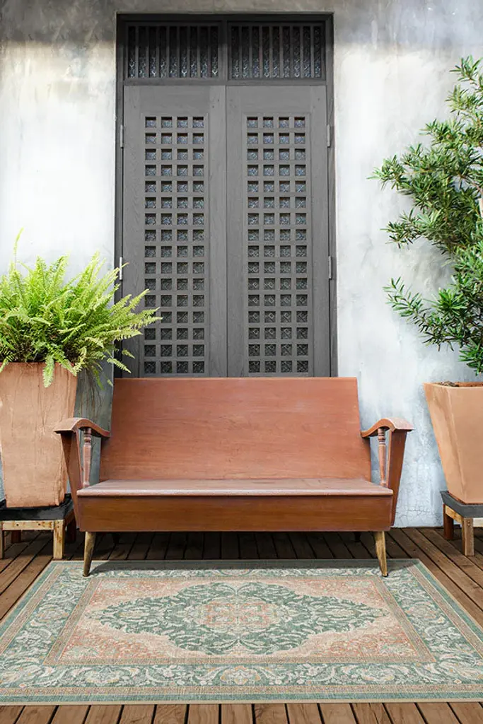 Reminiscent of a botanical garden. Our Allura Copper Sage Outdoor Rug features a lively bouquet center and intricate floral corners, complemented by a lovely vine border, in shades of sage green, coral, yellow, terracotta and soft cream. Made from our extra-durable, machine-washable material that's perfect for both outdoor and indoor use, especially high-traffic areas and those exposed to the elements.