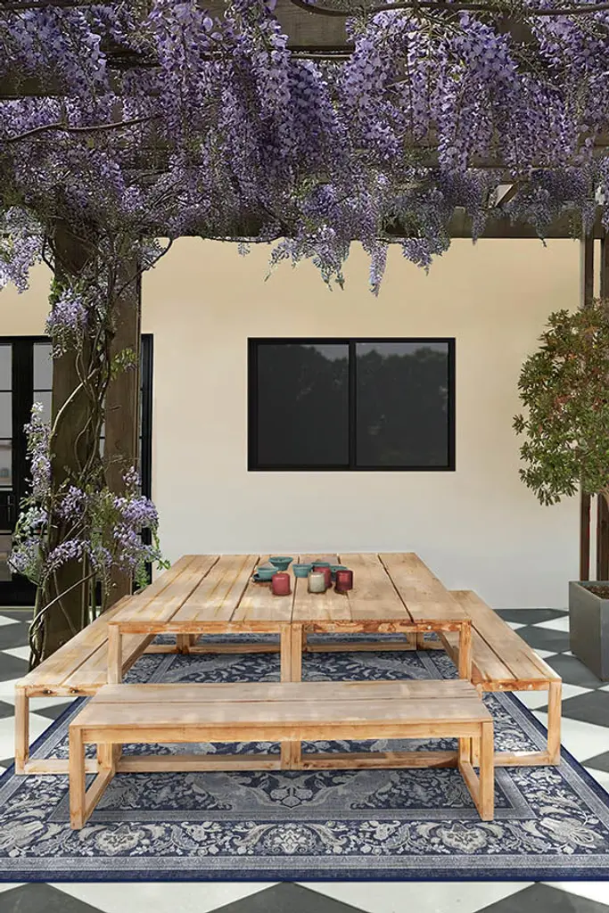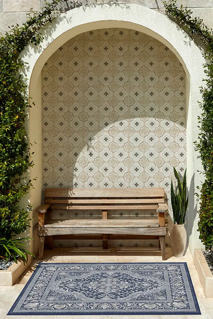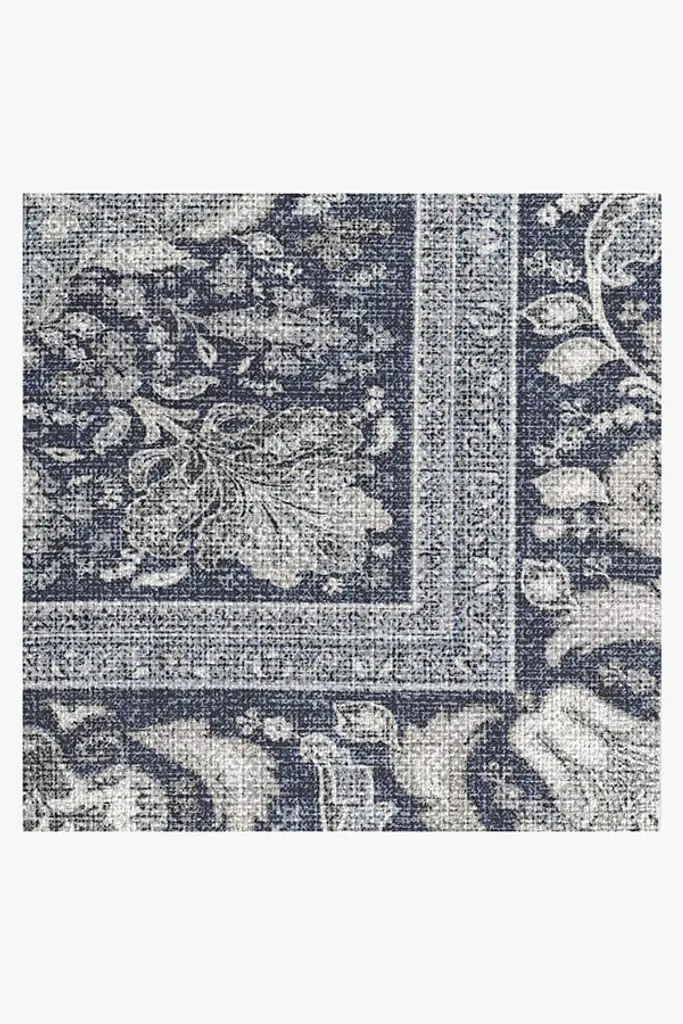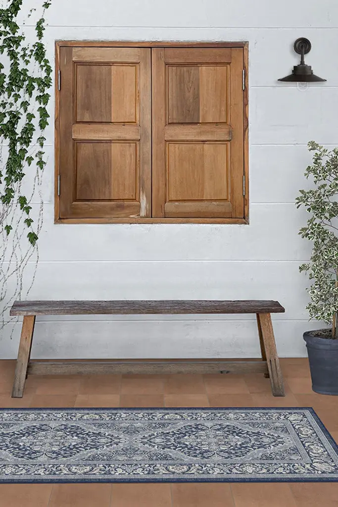Reminiscent of a botanical garden. Our Allura Soft Navy Outdoor Rug features a lively bouquet center and intricate floral corners, complemented by a lovely vine border, in shades of dark and light blue with grey. Made from our extra-durable, machine-washable material that's perfect for both outdoor and indoor use, especially high-traffic areas and those exposed to the elements.