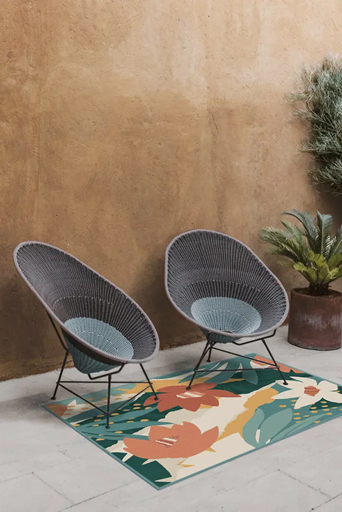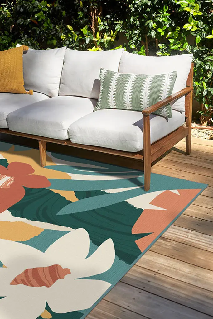 Transform your home into paradise. Featuring a semi-abstract floral design, our Arcadia Multicolor Rug is inspired by the atmosphere of the tropics and comes in a vintage color palette of coral, tangerine orange, yellow, and varying shades of teal. The extra-durable, machine-washable material is perfect for both outdoor and indoor use, especially high-traffic areas and those exposed to the elements.