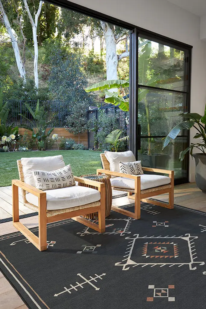 By playing with texture and a pared-down color palette, our Damali Black Multicolor Rug pays homage to traditional design. A trio of diamonds, tinted in cream with pops of teal blue, soft rose, and red, serve as the centerpiece of this rug. The soft black background and subtle linework contrast for a modern, minimalistic appeal. The extra-durable, machine-washable material is perfect for both outdoor and indoor use, especially high-traffic areas and those exposed to the elements. Rug colors may vary slightly according to your device and the lighting in your space.