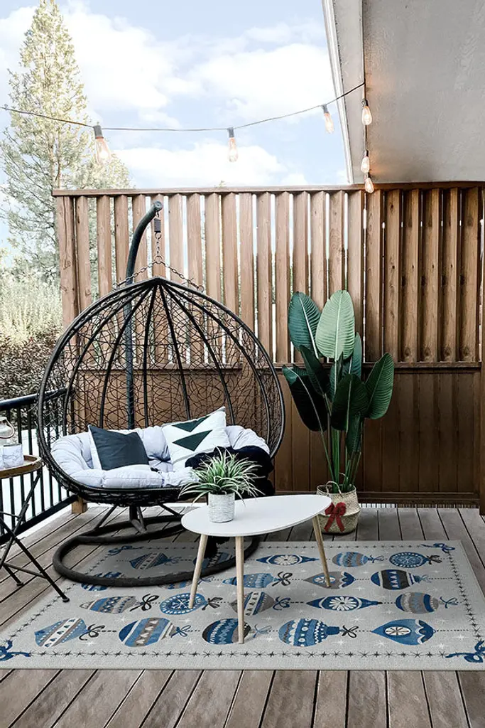 The perfect wintry and whimsical accent for your home. Our Festive Garland Blue Grey Rug features vintage holiday ornaments in a range of blue hues against a calming light grey background. The pattern is complete with a subtle starburst border and adorable blue bows at each corner. The extra-durable, machine-washable material is perfect for both outdoor and indoor use, especially high-traffic areas and those exposed to the elements.