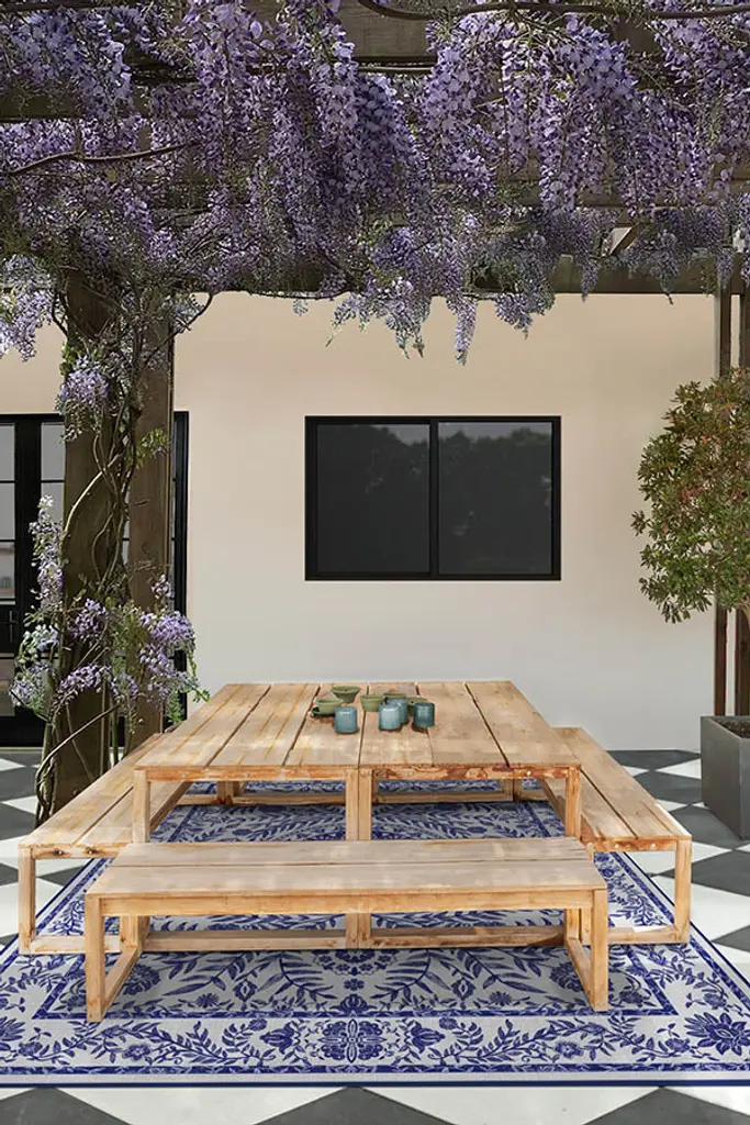 Floral finesse. Our Fontaine Delt Blue Outdoor Rug features intricate floral vines and decorative flowers inspired by traditional European woodblock prints in bright blue set atop a white background. Made from our extra-durable, machine-washable material that's perfect for both outdoor and indoor use, especially high-traffic areas and those exposed to the elements.