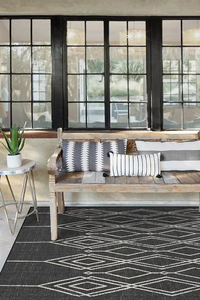 A relaxed, boho vibe. The off-white elongated diamonds create a lattice design that draws the eye across this black outdoor rug. Its extra-durable, machine-washable material makes this rug suited for high-traffic indoor and outdoor areas.