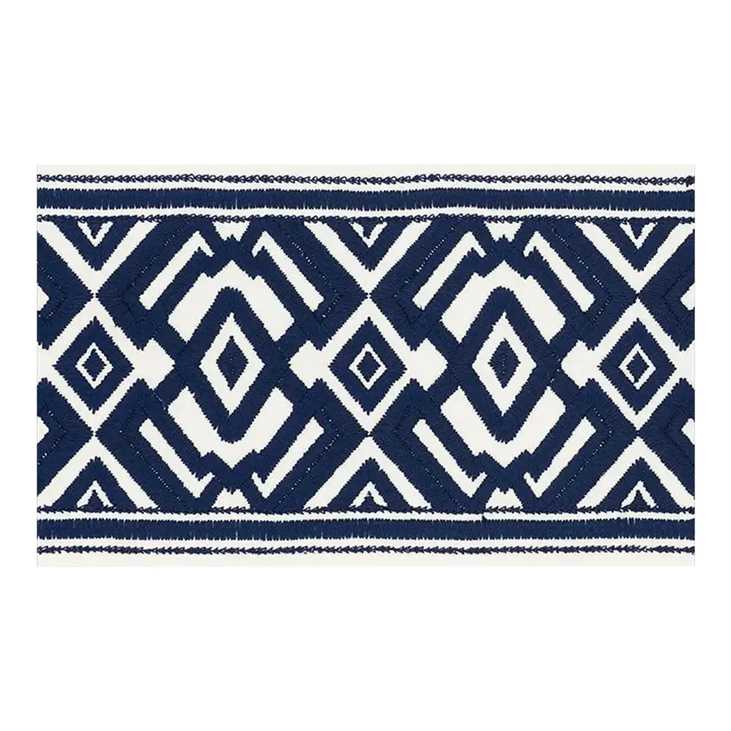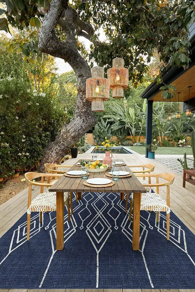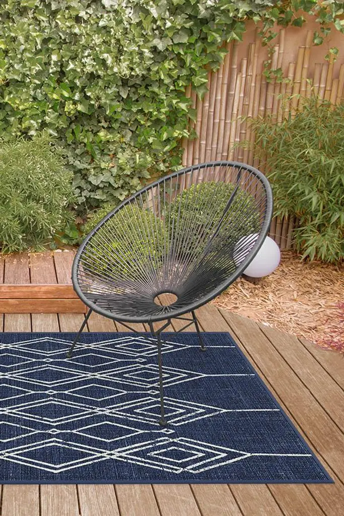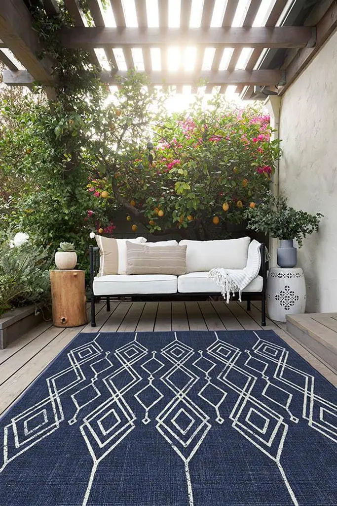 A laidback lattice design. The elongated off-white diamond pattern has a hand-drawn feel that gives this navy outdoor rug a boho vibe. Made with an extra-durable, machine-washable, and fade-resistant material that'll look good in any indoor or outdoor space.
