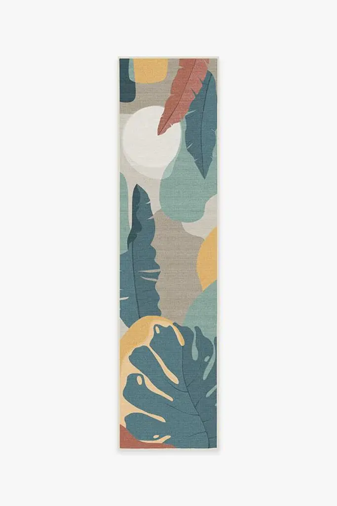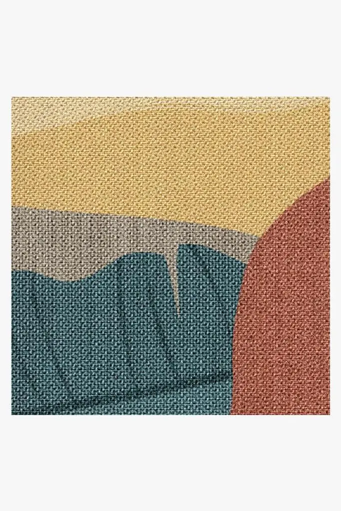 Minimal yet bold. This outdoor rug features a muted palette of teal-grey, copper terracotta, and marigold yellow reminiscent of a tropical oasis. The extra-durable, machine-washable material is perfect for your patio, deck, or any indoor or outdoor space.