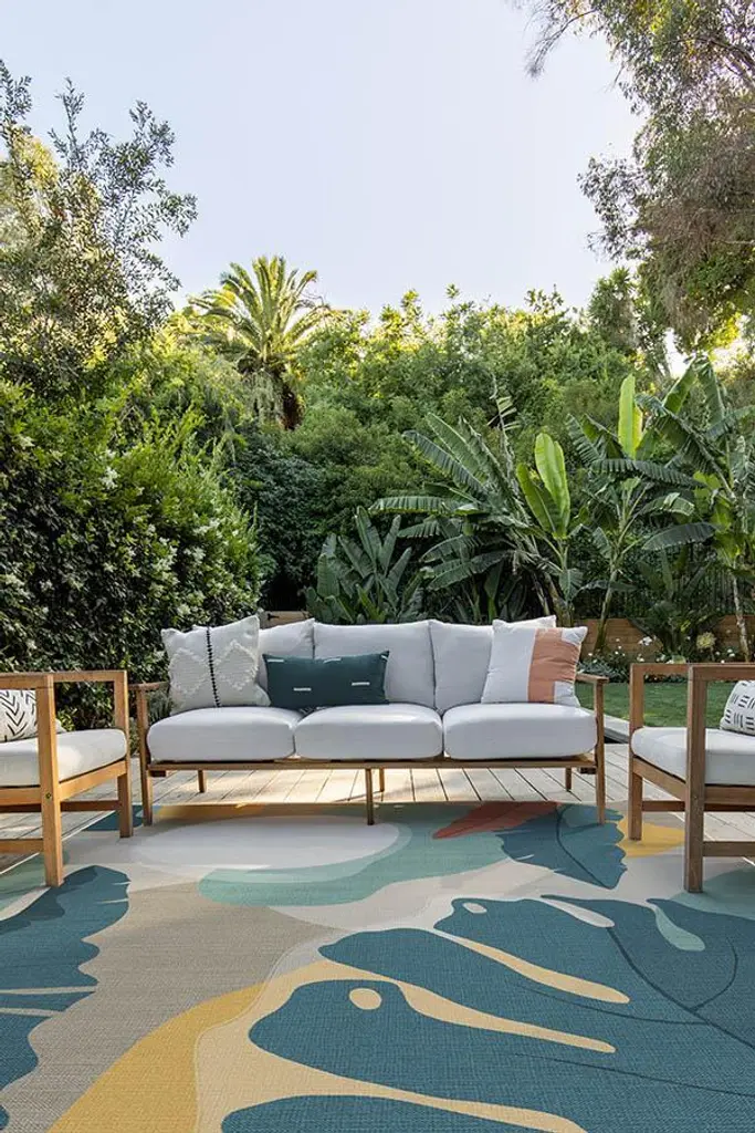 Minimal yet bold. This outdoor rug features a muted palette of teal-grey, copper terracotta, and marigold yellow reminiscent of a tropical oasis. The extra-durable, machine-washable material is perfect for your patio, deck, or any indoor or outdoor space.