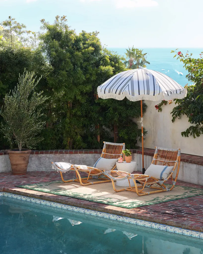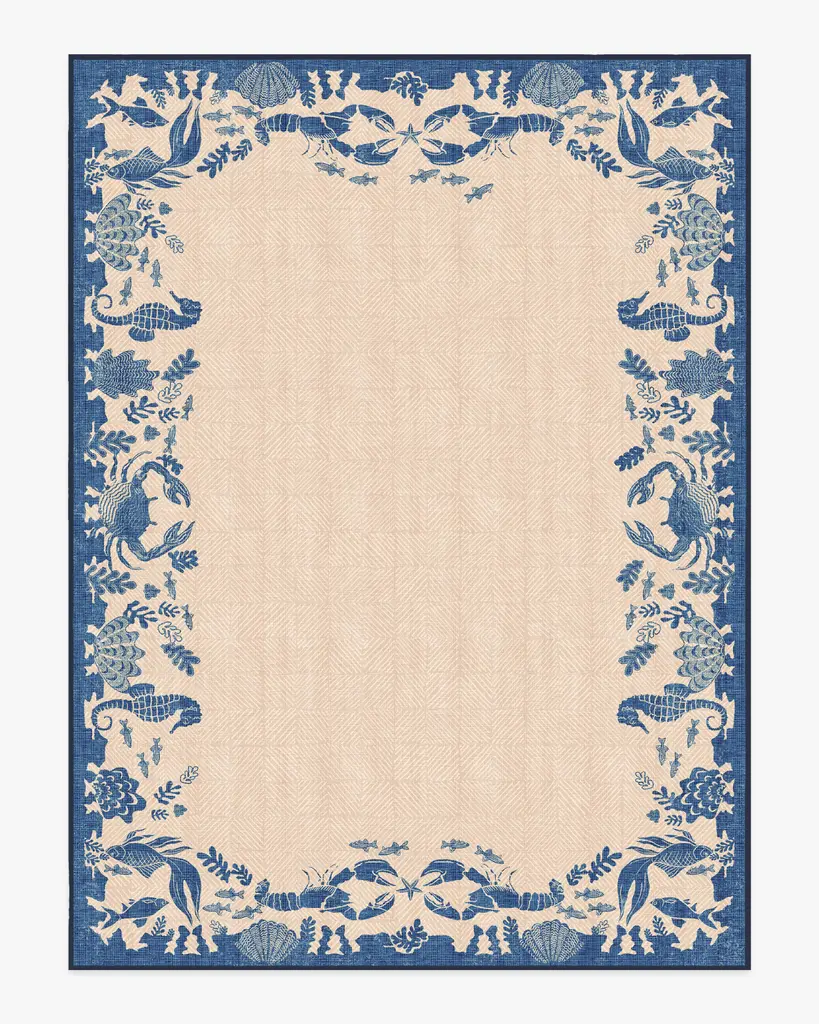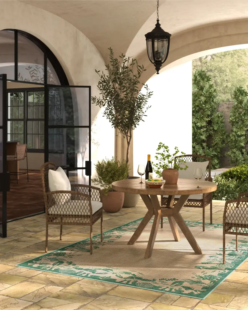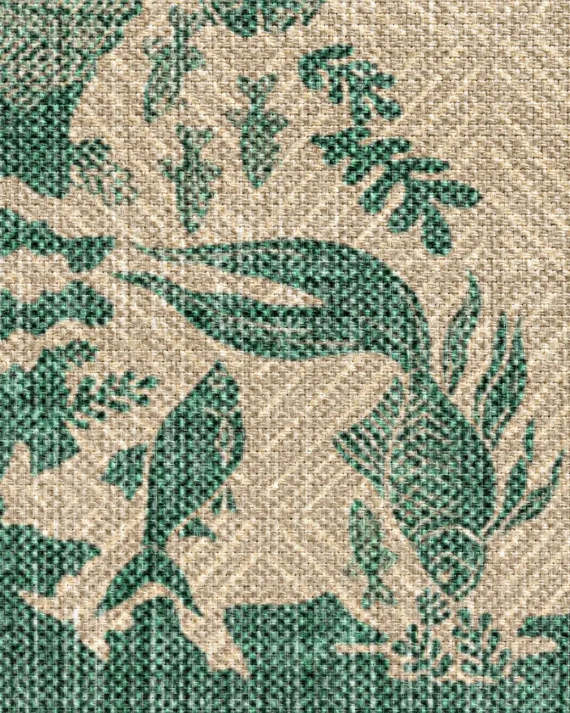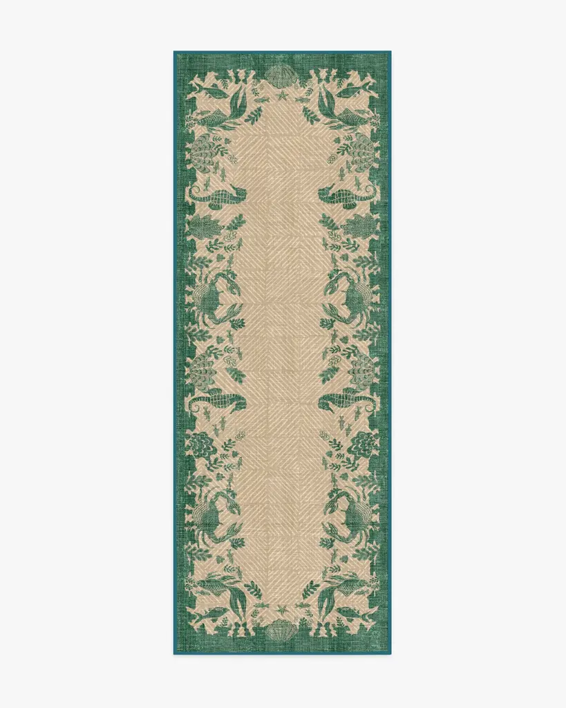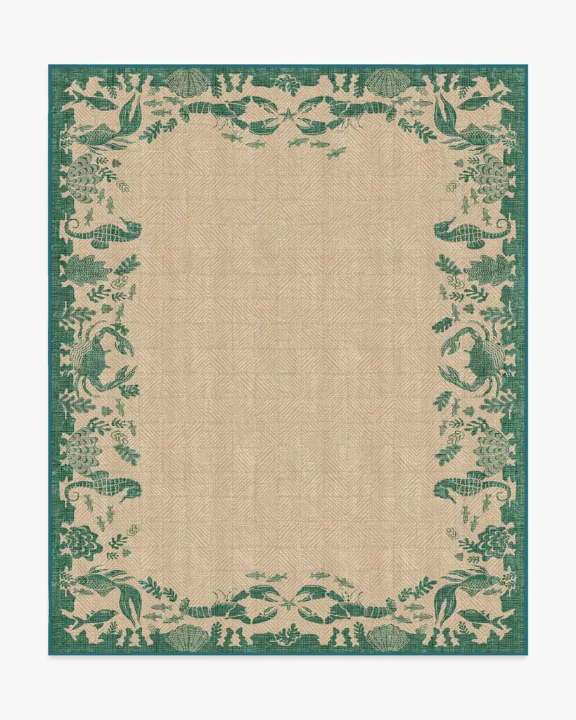 Inspired by charming Italian seaside villages and the artistry of Matisse, Outdoor Ionia Emerald & Tan Rug features a border of oceanic scenes paired with textural patterns. The emerald green contrasts against a tan background, adding a coastal touch to both outdoor and indoor spaces. The extra-durable, machine-washable material is perfect for both outdoor and indoor use, especially high-traffic areas and those exposed to the elements. Rug colors may vary slightly according to your device and the lighting in your space.