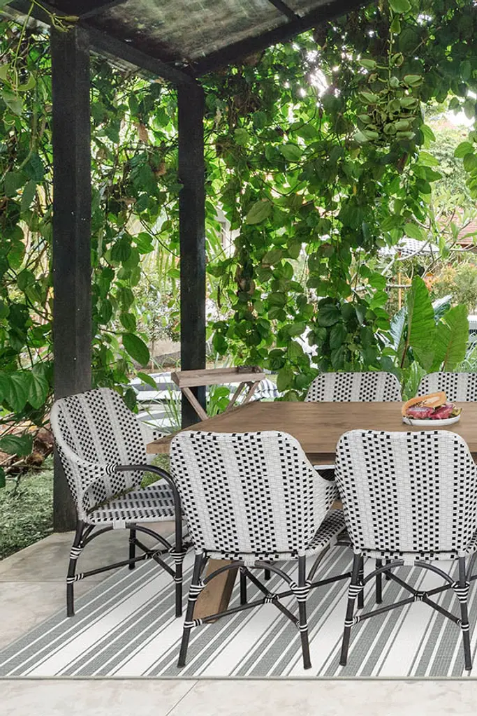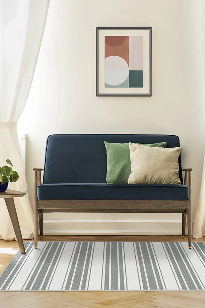 A go-with-anything design. Our Marina Stripe Grey Rug has a mix of bold and thin grey lines set against a white background and is inspired by cabana stripes found on beaches in the Mediterranean. The extra-durable, machine-washable material is perfect for both outdoor and indoor use, especially high-traffic areas and those exposed to the elements.
