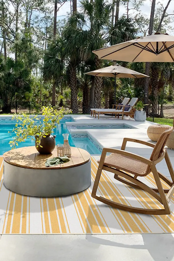 Classic, but with a modern twist. Our Marina Stripe Yellow Rug is inspired by the cabana stripes seen on the shores of the Mediterranean and features a mix of bold and thin vintage yellow lines set against a white background. The extra-durable, machine-washable material is perfect for both outdoor and indoor use, especially high-traffic areas and those exposed to the elements.