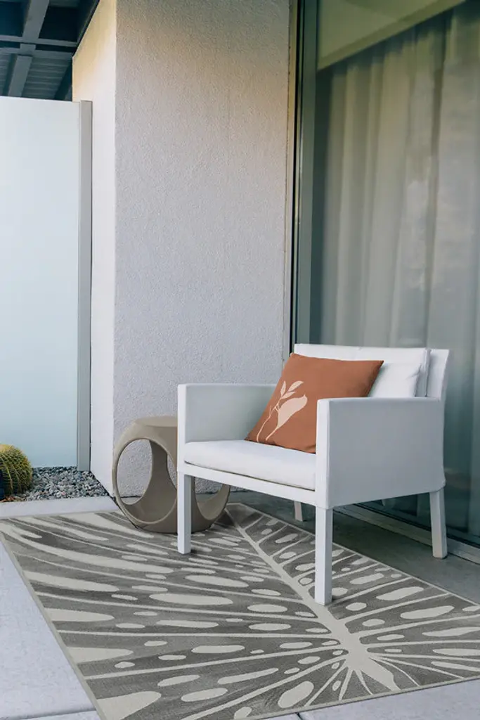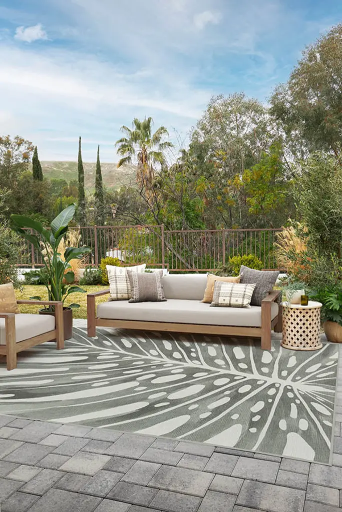 A striking monstera leaf design with an abstract twist. This botanical outdoor rug features soft shades of grey and cream that give the bold design a neutral feel. The durable material is machine-washable and designed for easy cleaning, making it perfect for your porch, patio, deck, or any indoor or outdoor space.