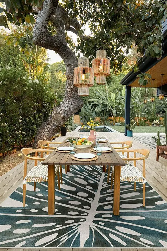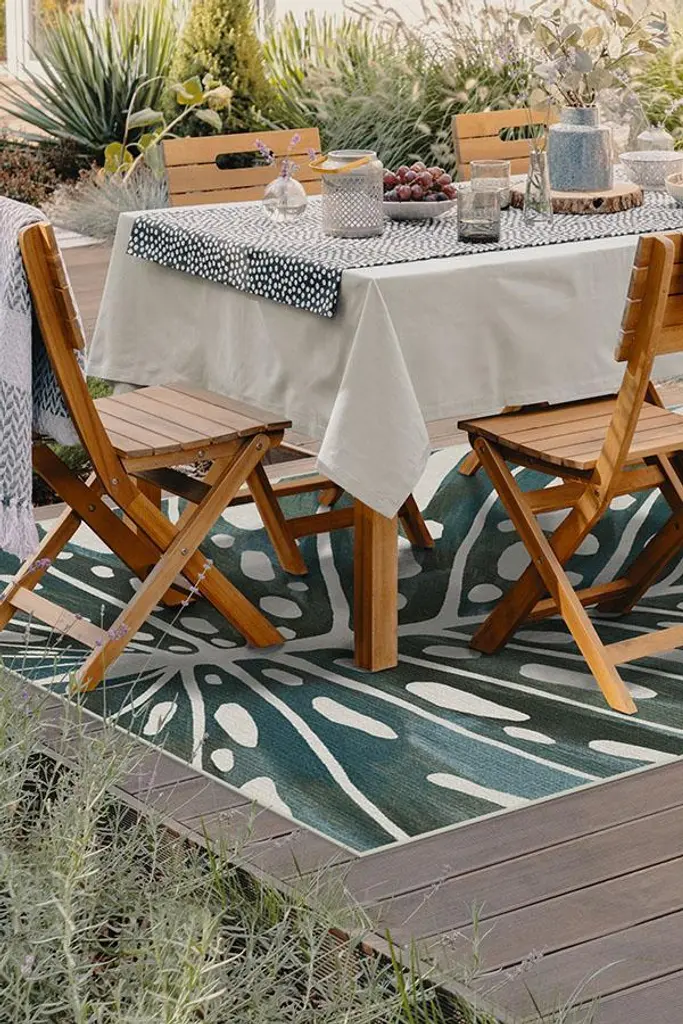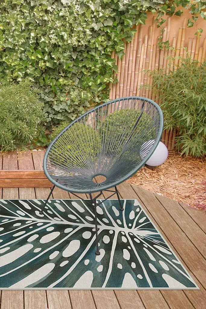 An oversized monstera leaf in a painterly style. This tropical outdoor rug features muted tones of hunter and sage green with pops of beige. Made with an extra-durable and machine-washable material, this rug is designed to be easily cleaned, perfect for any indoor or outdoor space.