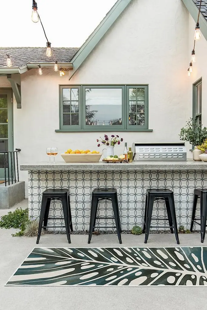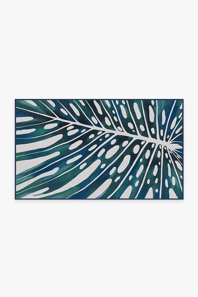 An oversized monstera leaf in a painterly style. This tropical outdoor rug features muted tones of hunter and sage green with pops of beige. Made with an extra-durable and machine-washable material, this rug is designed to be easily cleaned, perfect for any indoor or outdoor space.