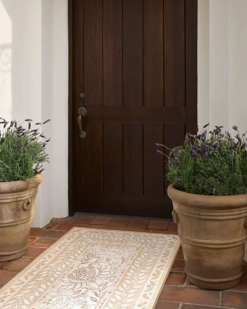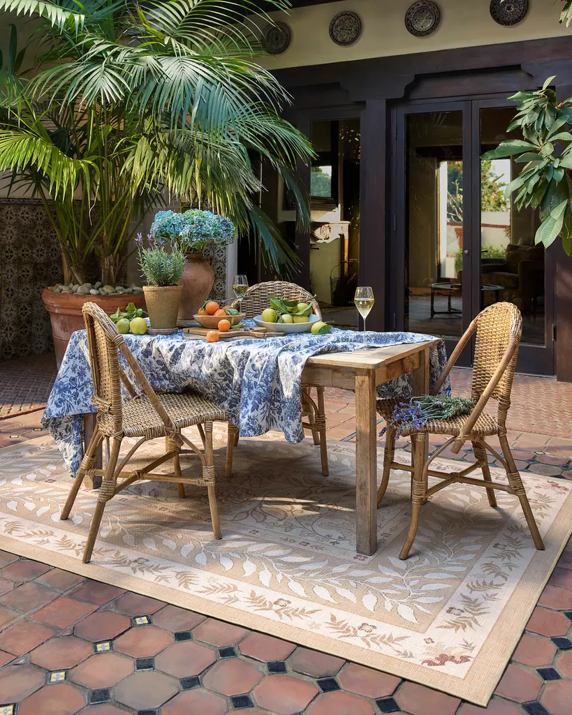 Inspired by rustic woven textiles and traditional block print techniques, our Outdoor Provence Wheat Rug features an inset border with lovely botanical details. A palette of warm neutral tones contrasted with cream and subtle pops of green, plum and pink look great in any outdoor or indoor space. The extra-durable, machine-washable material is perfect for both outdoor and indoor use, especially high-traffic areas and those exposed to the elements. Rug colors may vary slightly according to your device and the lighting in your space.