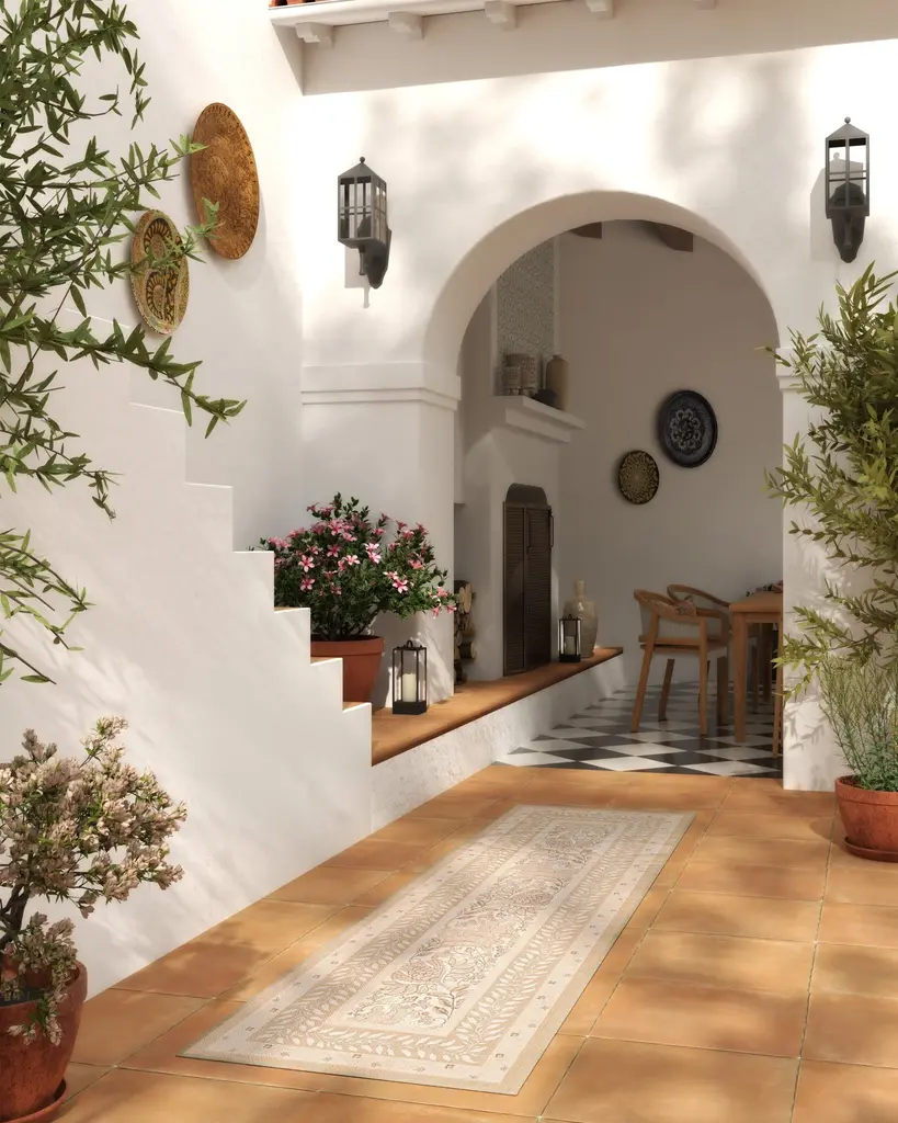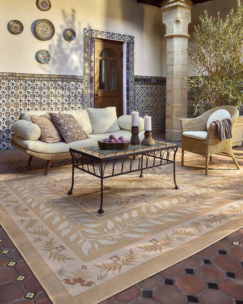 Inspired by rustic woven textiles and traditional block print techniques, our Outdoor Provence Wheat Rug features an inset border with lovely botanical details. A palette of warm neutral tones contrasted with cream and subtle pops of green, plum and pink look great in any outdoor or indoor space. The extra-durable, machine-washable material is perfect for both outdoor and indoor use, especially high-traffic areas and those exposed to the elements. Rug colors may vary slightly according to your device and the lighting in your space.