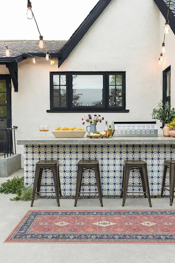 A stylish statement. Our Ranier Cayenne Red Outdoor Rug features geometric motifs with ornate elements in shades of orange-red, coral, and navy. Made from our extra-durable, machine-washable material that's perfect for both outdoor and indoor use, especially high-traffic areas and those exposed to the elements.