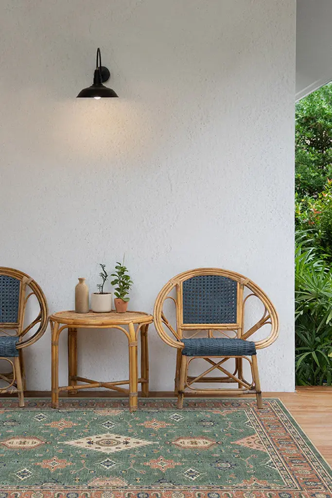 A stylish statement. Our Ranier Copper Sage Outdoor Rug features geometric motifs with ornate elements in shades of sage, coral, ivory, and blue. Made from our extra-durable, machine-washable material that's perfect for both outdoor and indoor use, especially high-traffic areas and those exposed to the elements.