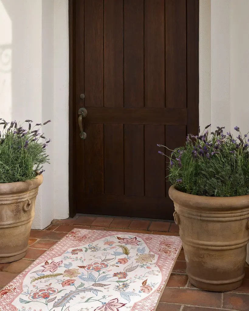 Inspired by Indian chintz prints, our Outdoor Rosalee Red Multicolor Rug features a large-scale, statement floral framed by an ogee shape with an intricate pattern fill and distressed effect to create depth. The red palette, highlighted by pinks, burgundy, and coral, contrasts beautifully against a cream background, while accents of blues, greens, and yellows add an eye-catching pop within the central floral structure. The extra-durable, machine-washable material is perfect for both outdoor and indoor use, especially high-traffic areas and those exposed to the elements. Rug colors may vary slightly according to your device and the lighting in your space.