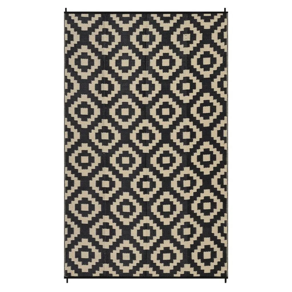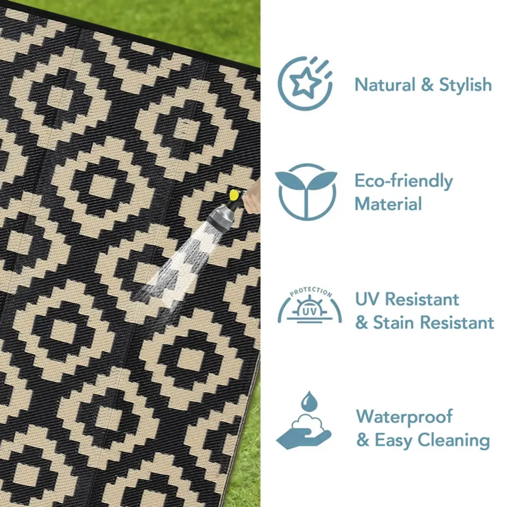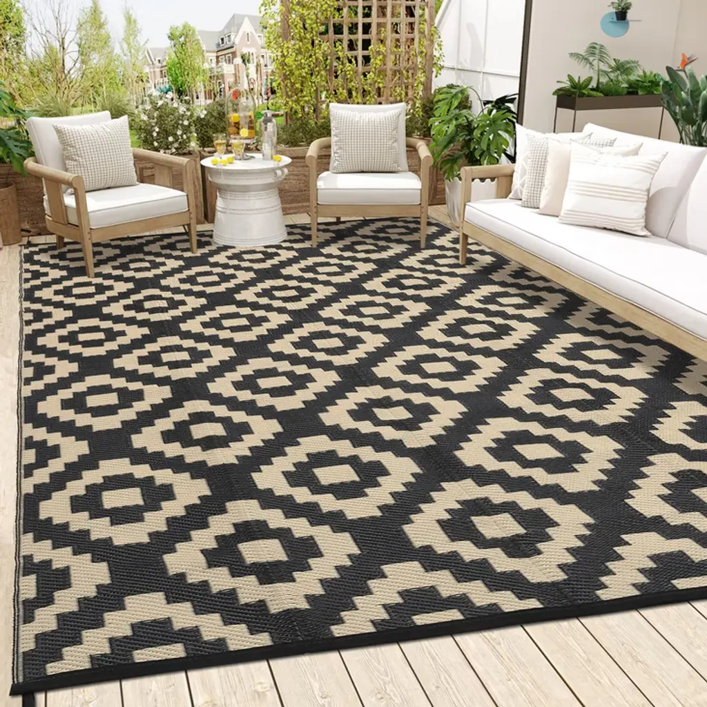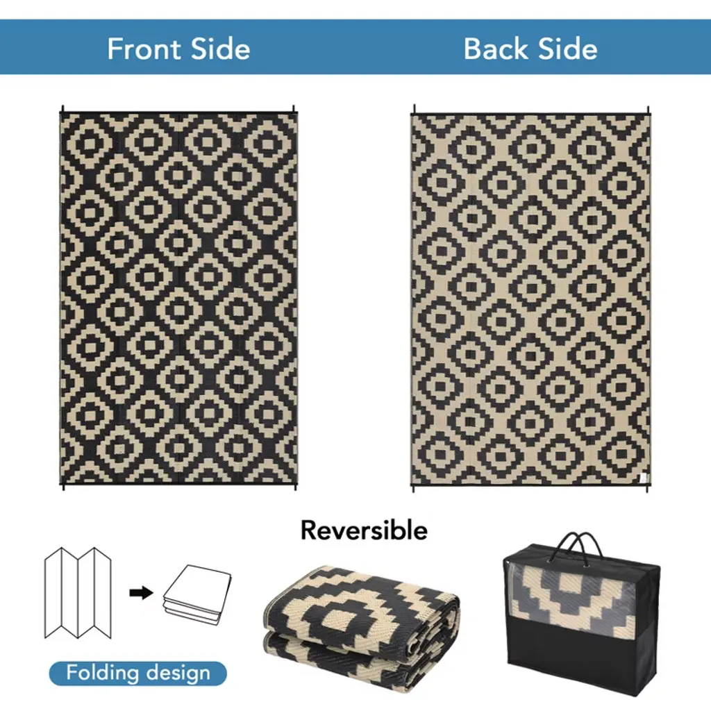 【Reversible & Durable】Our outdoor patio plastic rugs are made from synthetic polypropylene, featuring a reversible design that allows you to use both sides. Outdoor rug along with edging that is heat treated to avoid fraying, soft and durable, low-maintenance. 【Easy to Clean & Portable】The waterproof woven rug is quick dry and easy clean. When your pet steps with the dirt and enters the house, or when you lay out the shoes you walked outside at the door of your RV, just quickly clean away dirt with a hose or wipe with wet cloth, then let them dry in the sun. Every rug comes with a carry bag for easy transport. 【UV Stable & Fade Resistant】 Our premium quality rugs which are made from recycled plastic and highly-durable UV coated polypropylene, could protect for long-lasting use even in stormy/windy/snowy weather. You could keep this rug outdoors all year round without tearing or fading. Our outdoor plastic straw rug is durable enough to withstand dog claws and prevent fraying. 【High-Quality & Eco-Friendly】Our patio rug is not only soft and comfortable, but more importantly, meets environmental standards and is safe for children and pets. The carpet will feature geometric and incorporate a mix of earthy hues, adding a playful touch to your outdoor space. 【Multiple Scenarios & Functional】Our camping rug is perfect for all seasons. With a boho stylish design, these functional rugs are perfect for all outdoor and indoor living areas, such as your patio, entryway, camping tent, balcony, rv trip, deck, pool, beach ,laundry room ,outdoor concert or even yoga exercise.