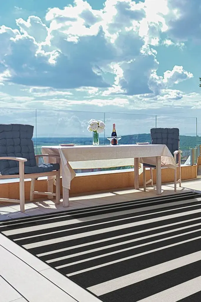 Give your space a nautical touch. Our Sailmaker Stripe Black Rug has a combination of thin and thick black and white stripes with a subtle herringbone texture. The extra-durable, machine-washable material is perfect for both outdoor and indoor use, especially high-traffic areas and those exposed to the elements.