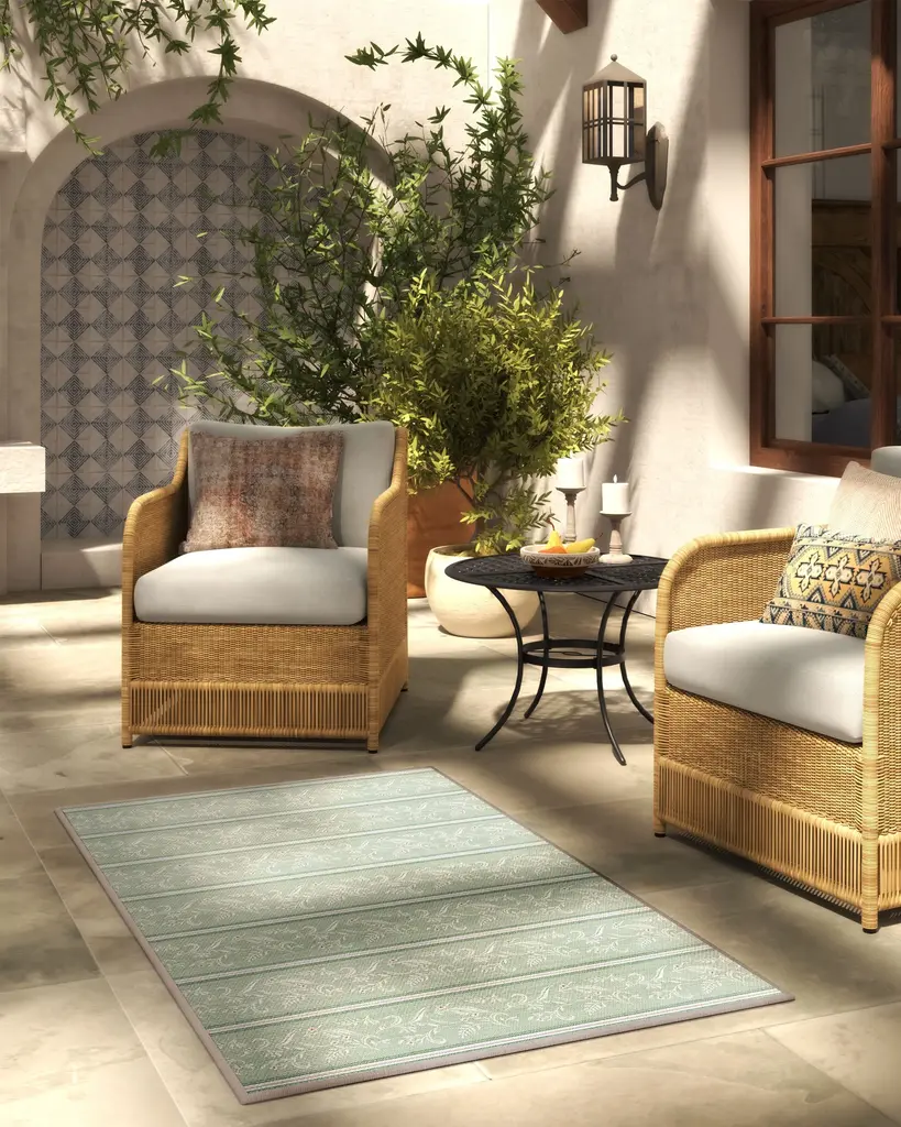 Add carefree coastal charm to your outdoor space with our Outdoor Sambuco Stripe Celadon Rug. This symmetrical design combines horizontal stripes made from florals and lines, blending geometric harmony with organic flow. The soft sage background is complemented by cream florals and soft red accents, with woven-inspired textures and subtle color shifts bringing the design to life. The extra-durable, machine-washable material is perfect for both outdoor and indoor use, especially high-traffic areas and those exposed to the elements. Rug colors may vary slightly according to your device and the lighting in your space.