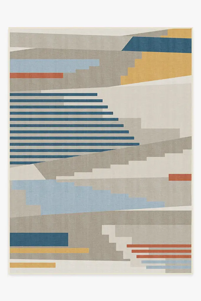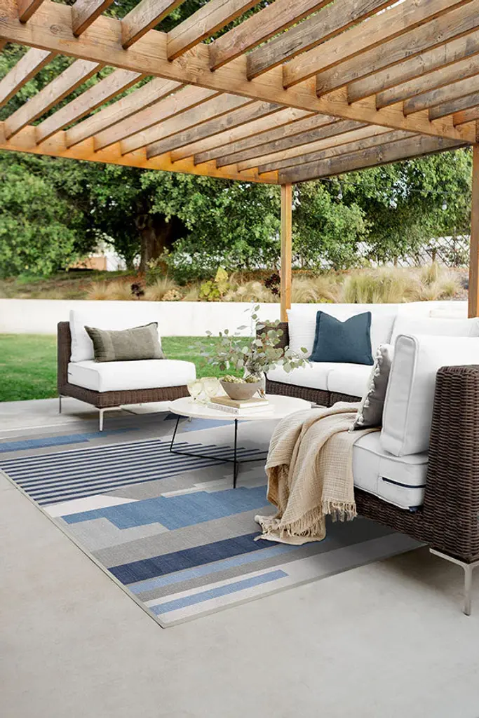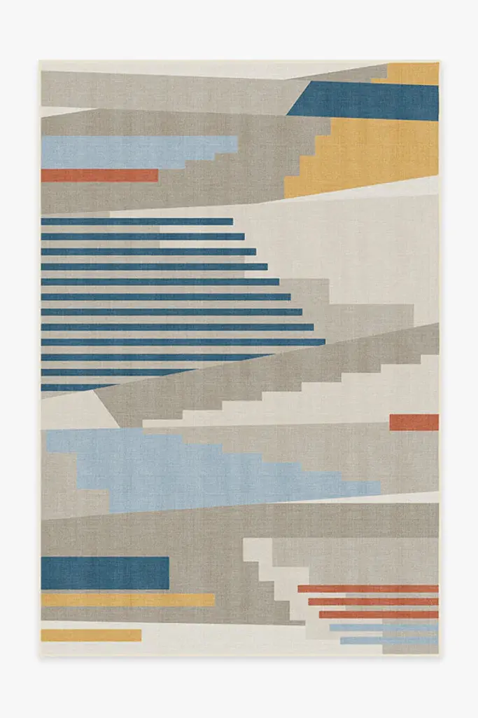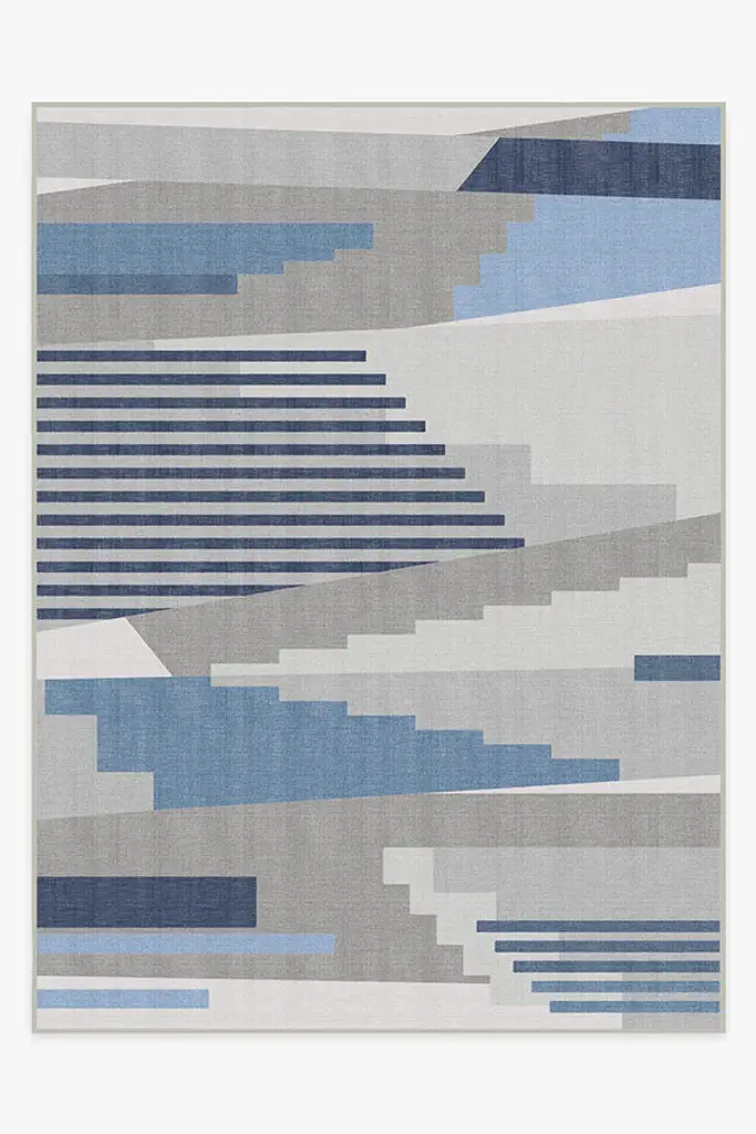 A modern, abstract eye-catcher. Inspired by dramatic cliff faces and playful color blocking seen in Bauhaus art, our Tropea Grey and Blue Rug pairs cool greys with sky blue, denim blue, and deep navy blue tones. The extra-durable, machine-washable material is perfect for both outdoor and indoor use, especially high-traffic areas and those exposed to the elements.