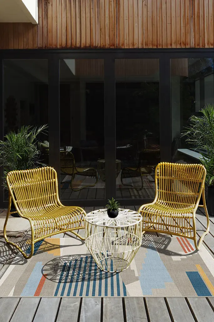 Colorfully abstract. Inspired by dramatic cliff faces and playful color blocking seen in Bauhaus art, our Tropea Multicolor Rug teams warm neutrals with bold pops of yellow, dark teal, light blue, and orange. The extra-durable, machine-washable material is perfect for both outdoor and indoor use, especially high-traffic areas and those exposed to the elements.
