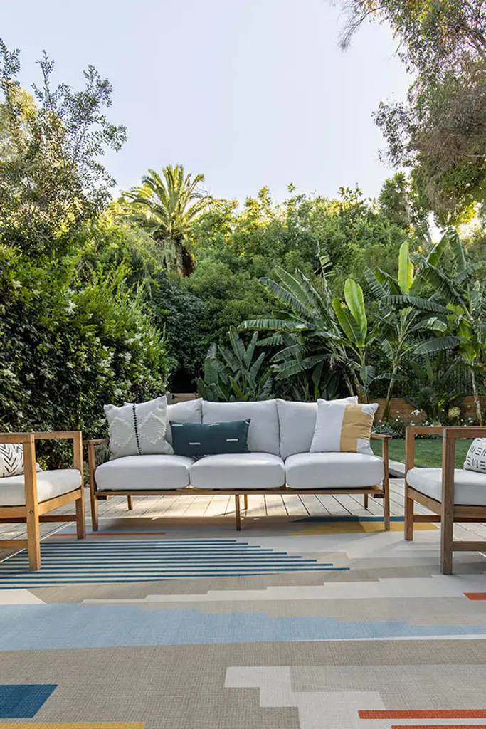 Colorfully abstract. Inspired by dramatic cliff faces and playful color blocking seen in Bauhaus art, our Tropea Multicolor Rug teams warm neutrals with bold pops of yellow, dark teal, light blue, and orange. The extra-durable, machine-washable material is perfect for both outdoor and indoor use, especially high-traffic areas and those exposed to the elements.