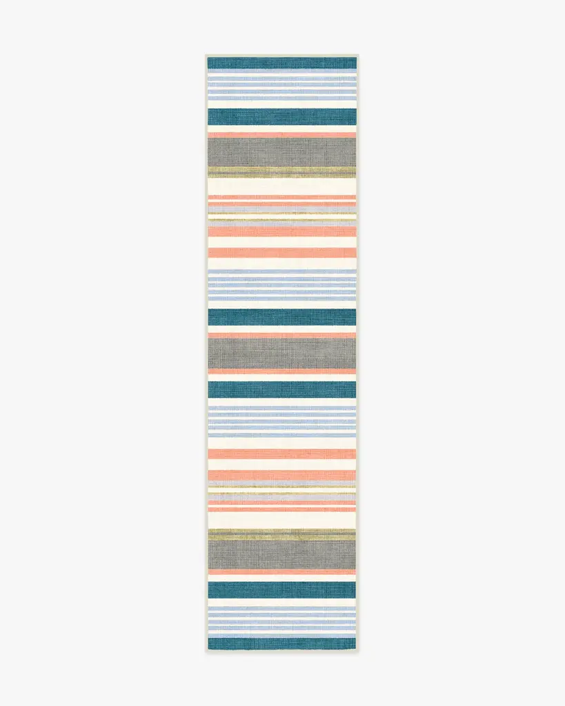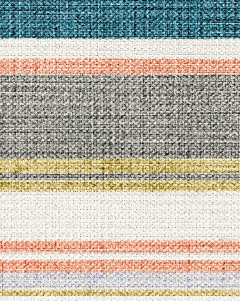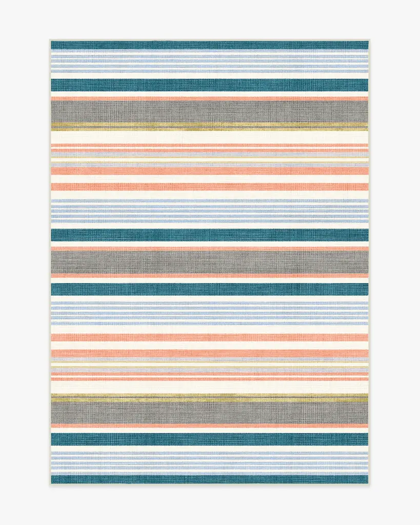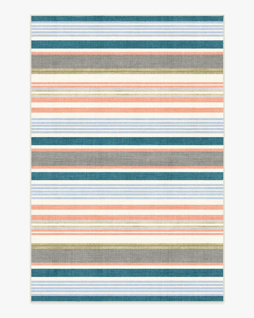 Inspired by soft, woven textures, our Outdoor Tropez Stripe Teal Multicolor Rug features horizontal, multi-color stripes that create rhythm and balance. A palette of teal paired with shades of blue, and creamy neutrals is complemented by subtle pops of coral pink and green. The extra-durable, machine-washable material is perfect for both outdoor and indoor use, especially high-traffic areas and those exposed to the elements. Rug colors may vary slightly according to your device and the lighting in your space.