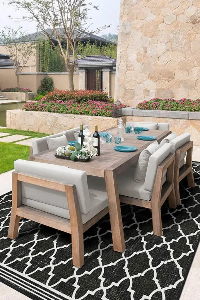The classic trellis pattern gets an update. Slightly distressed to mimic a woven feel, this black and white outdoor rug features multiple shapes to form a trellis. Machine-washable, extra-durable, and stain-resistant, it's perfect for any indoor or outdoor space.