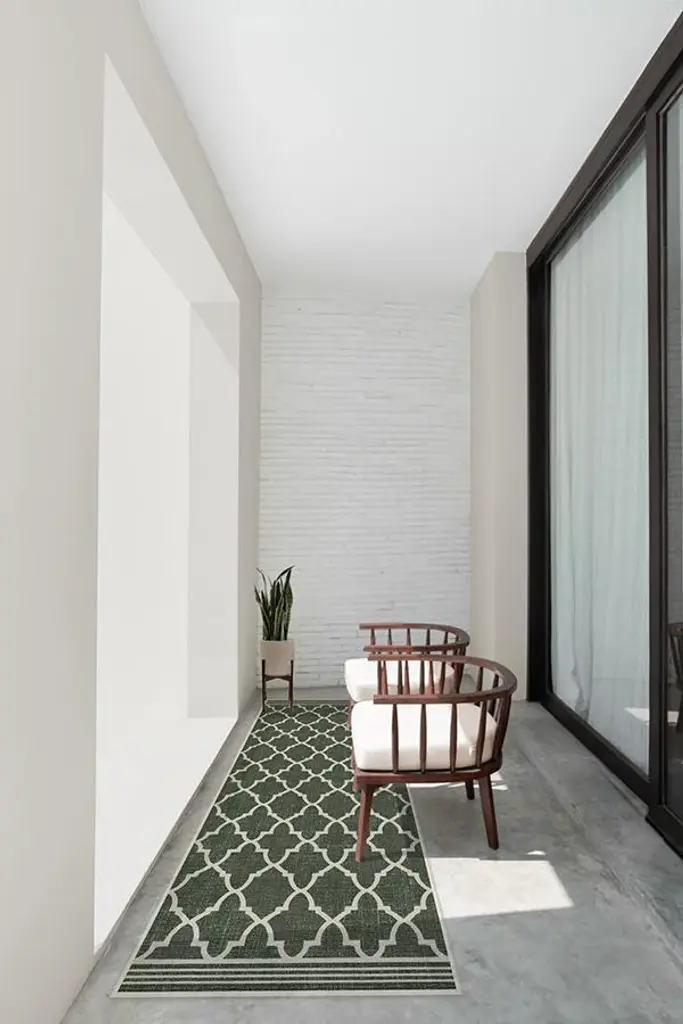 The trellis design gets a makeover. This outdoor rug features a repeating pattern of two different shapes in off-white on a dark green background. Made with a machine-washable and durable material that's designed to hold up well in high-traffic areas.