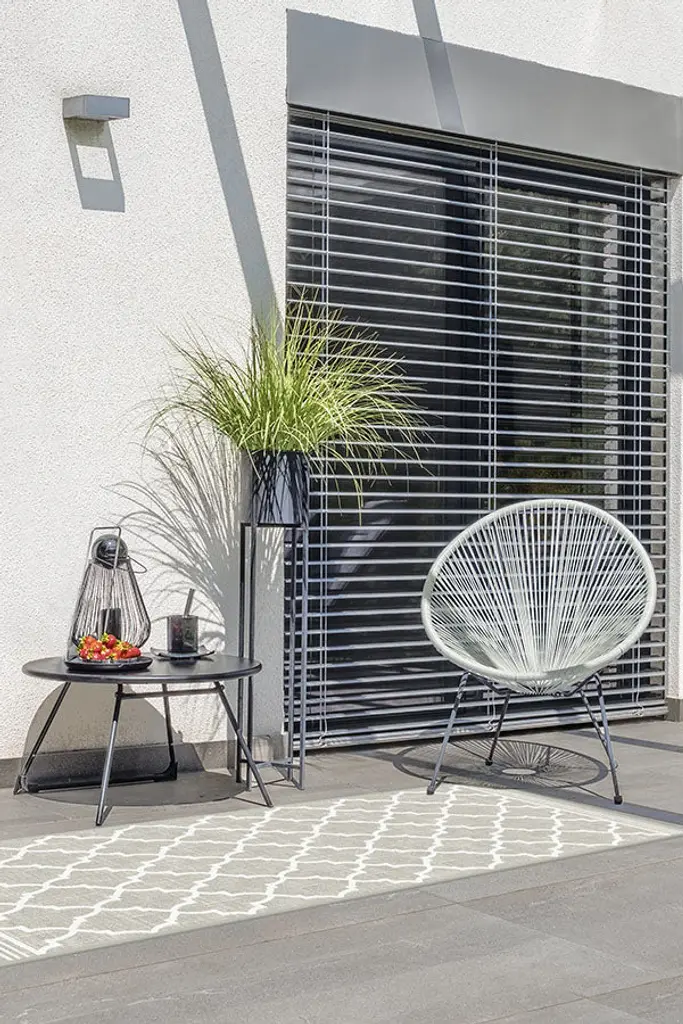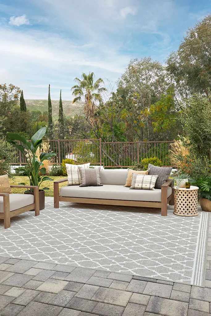 Elegant and goes with anything. This outdoor rug features two different repeating shapes in a fresh cream color on a light grey background. Made with a durable, machine-washable material that's easy to clean and designed to last, perfect for any indoor or outdoor space.
