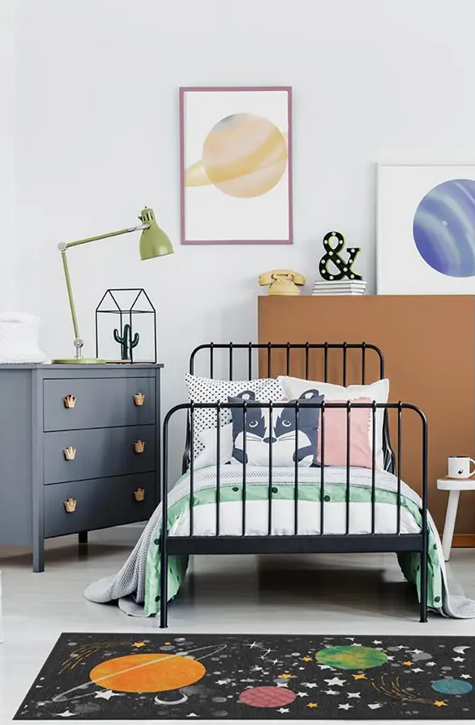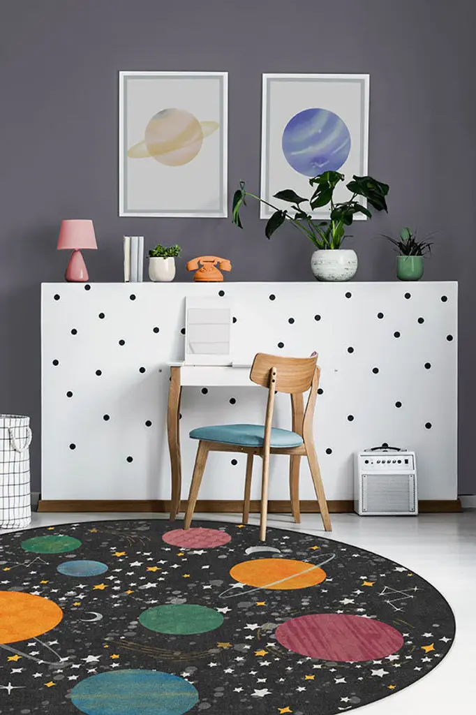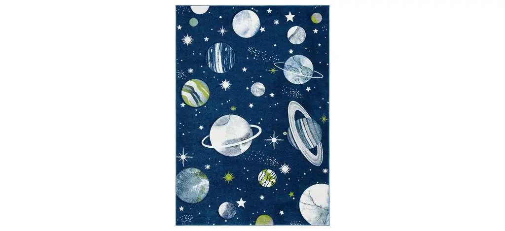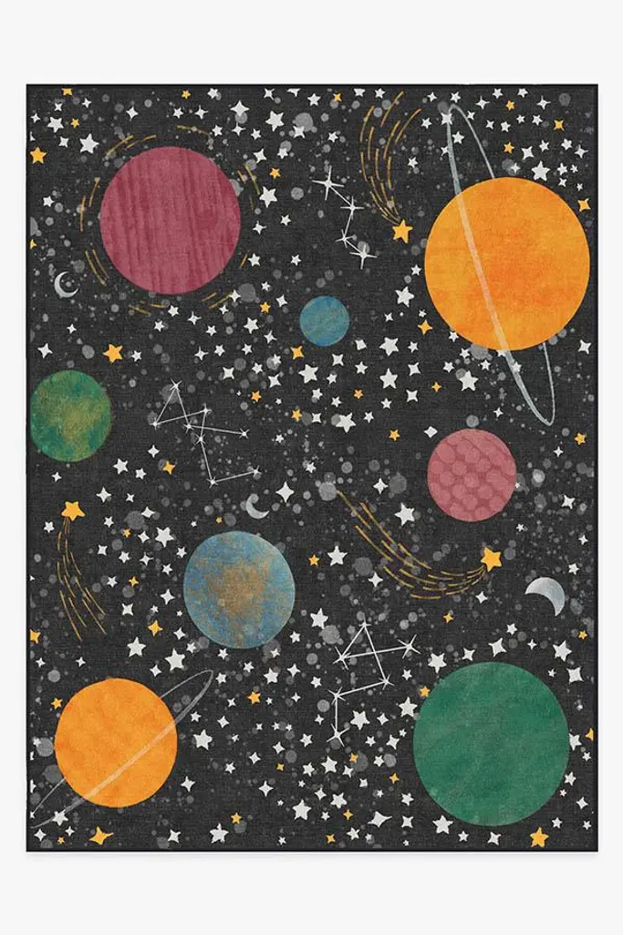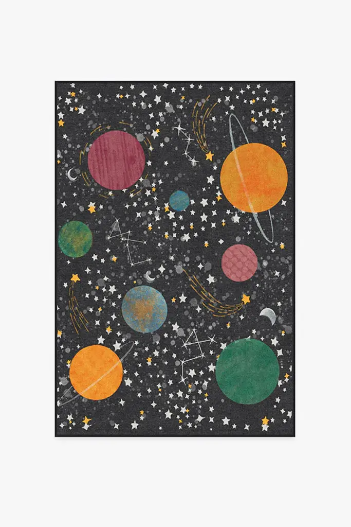 Give your child a rocket ride to the stars with Outer Space Black Rug. This cosmic rug design is filled with textured and brightly colored planets, in hues of arctic blue, evergreen, and rosewood, and surrounded by constellations and starry accents. It's the perfect kids' room rug for your little space explorers.