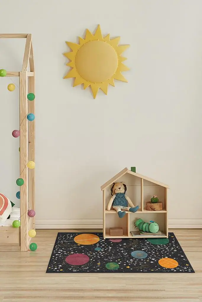 Give your child a rocket ride to the stars with Outer Space Black Rug. This cosmic rug design is filled with textured and brightly colored planets, in hues of arctic blue, evergreen, and rosewood, and surrounded by constellations and starry accents. It's the perfect kids' room rug for your little space explorers.